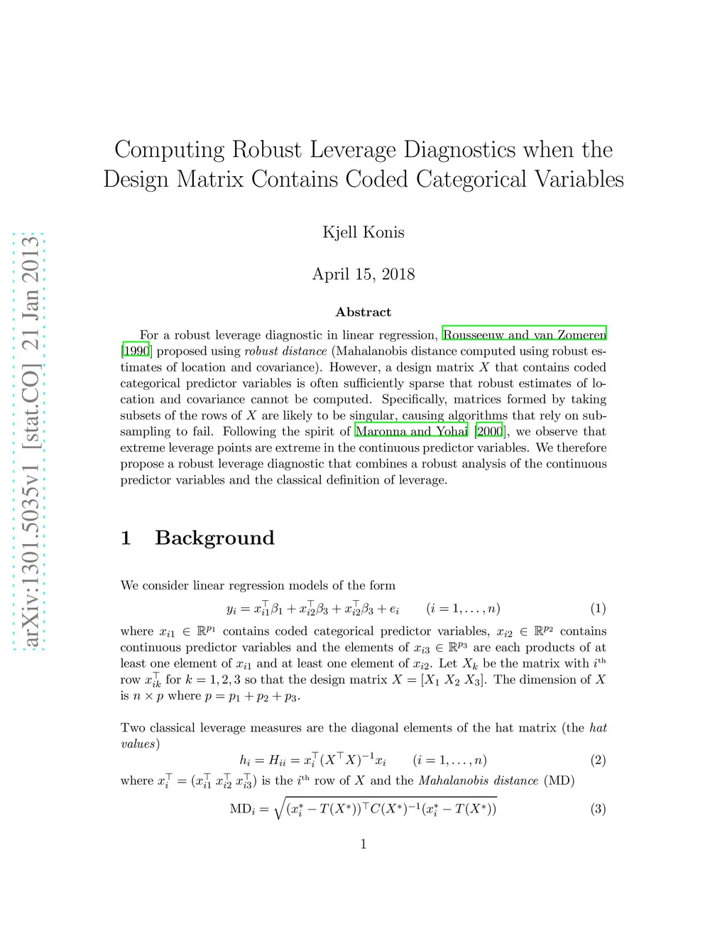 For a robust leverage diagnostic in linear regression, Rousseeuw and van Zomeren [1990] proposed using robust distance (Mahalanobis distance computed using robust estimates of location and covariance). However, a design matrix X that contains coded categorical predictor variables is often sufficiently sparse that robust estimates of location and covariance cannot be computed. Specifically, matrices formed by taking subsets of the rows of X are likely to be singular, causing algorithms that rely on subsampling to fail. Following the spirit of Maronna and Yohai [2000], we observe that extreme leverage points are extreme in the continuous predictor variables. We therefore propose a robust leverage diagnostic that combines a robust analysis of the continuous predictor variables and the classical definition of leverage.