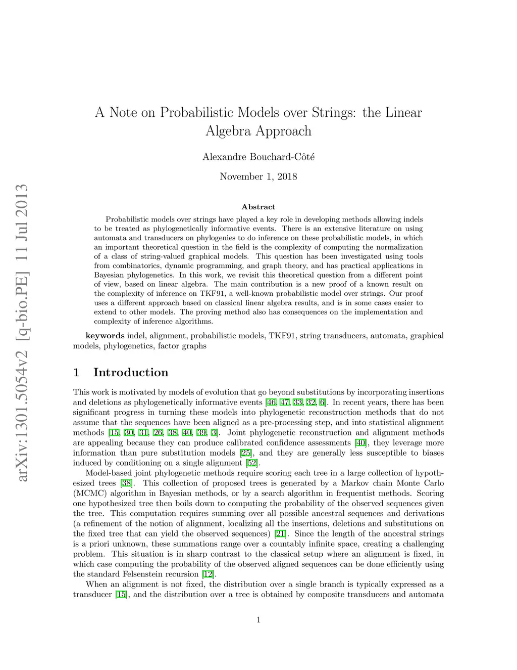 Probabilistic models over strings have played a key role in developing methods allowing indels to be treated as phylogenetically informative events. There is an extensive literature on using automata and transducers on phylogenies to do inference on these probabilistic models, in which an important theoretical question in the field is the complexity of computing the normalization of a class of string-valued graphical models. This question has been investigated using tools from combinatorics, dynamic programming, and graph theory, and has practical applications in Bayesian phylogenetics. In this work, we revisit this theoretical question from a different point of view, based on linear algebra. The main contribution is a new proof of a known result on the complexity of inference on TKF91, a well-known probabilistic model over strings. Our proof uses a different approach based on classical linear algebra results, and is in some cases easier to extend to other models. The proving method also has consequences on the implementation and complexity of inference algorithms.