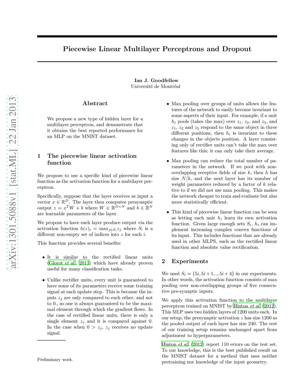 Piecewise Linear Multilayer Perceptrons and Dropout