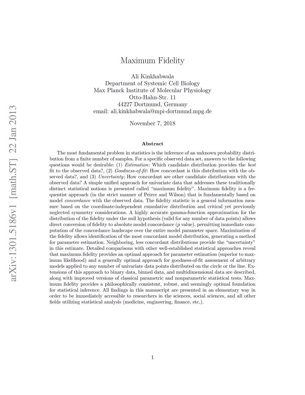 The most fundamental problem in statistics is the inference of an unknown probability distribution from a finite number of samples. For a specific observed data set, answers to the following questions would be desirable: (1) Estimation: Which candidate distribution provides the best fit to the observed data?, (2) Goodness-of-fit: How concordant is this distribution with the observed data?, and (3) Uncertainty: How concordant are other candidate distributions with the observed data? A simple unified approach for univariate data that addresses these traditionally distinct statistical notions is presented called "maximum fidelity". Maximum fidelity is a strict frequentist approach that is fundamentally based on model concordance with the observed data. The fidelity statistic is a general information measure based on the coordinate-independent cumulative distribution and critical yet previously neglected symmetry considerations. An approximation for the null distribution of the fidelity allows its direct conversion to absolute model concordance (p value). Fidelity maximization allows identification of the most concordant model distribution, generating a method for parameter estimation, with neighboring, less concordant distributions providing the "uncertainty" in this estimate. Maximum fidelity provides an optimal approach for parameter estimation (superior to maximum likelihood) and a generally optimal approach for goodness-of-fit assessment of arbitrary models applied to univariate data. Extensions to binary data, binned data, multidimensional data, and classical parametric and nonparametric statistical tests are described. Maximum fidelity provides a philosophically consistent, robust, and seemingly optimal foundation for statistical inference. All findings are presented in an elementary way to be immediately accessible to all researchers utilizing statistical analysis.