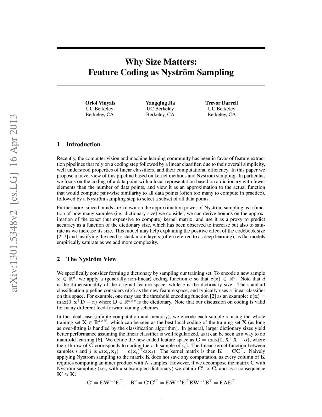 Why Size Matters: Feature Coding as Nystrom Sampling