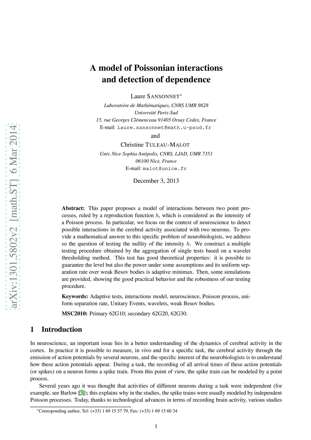 This paper proposes a model of interactions between two point processes, ruled by a reproduction function h, which is considered as the intensity of a Poisson process. In particular, we focus on the context of neurosciences to detect possible interactions in the cerebral activity associated with two neurons. To provide a mathematical answer to this specific problem of neurobiologists, we address so the question of testing the nullity of the intensity h. We construct a multiple testing procedure obtained by the aggregation of single tests based on a wavelet thresholding method. This test has good theoretical properties: it is possible to guarantee the level but also the power under some assumptions and its uniform separation rate over weak Besov bodies is adaptive minimax. Then, some simulations are provided, showing the good practical behavior of our testing procedure.