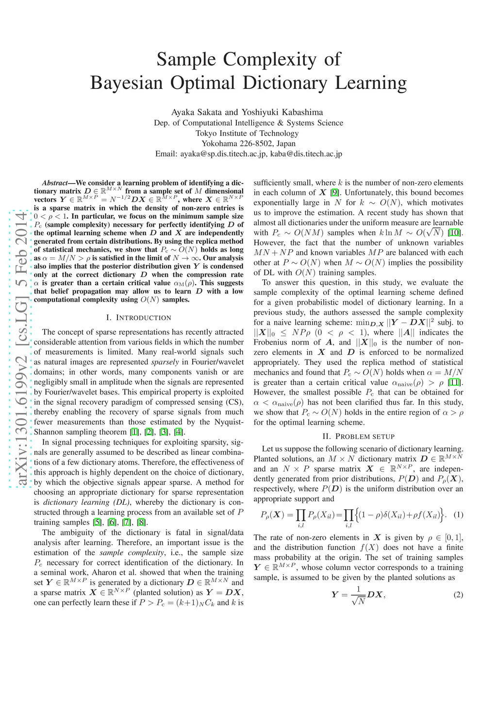 We consider a learning problem of identifying a dictionary matrix D (M times N dimension) from a sample set of M dimensional vectors Y = N^{-1/2} DX, where X is a sparse matrix (N times P dimension) in which the density of non-zero entries is 0<rho< 1. In particular, we focus on the minimum sample size P_c (sample complexity) necessary for perfectly identifying D of the optimal learning scheme when D and X are independently generated from certain distributions. By using the replica method of statistical mechanics, we show that P_c=O(N) holds as long as alpha = M/N >rho is satisfied in the limit of N to infinity. Our analysis also implies that the posterior distribution given Y is condensed only at the correct dictionary D when the compression rate alpha is greater than a certain critical value alpha_M(rho). This suggests that belief propagation may allow us to learn D with a low computational complexity using O(N) samples.