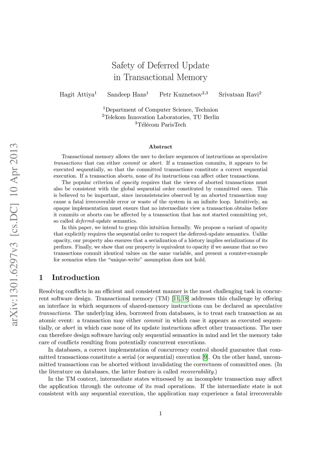 Transactional memory allows the user to declare sequences of instructions as speculative \emph{transactions} that can either \emph{commit} or \emph{abort}. If a transaction commits, it appears to be executed sequentially, so that the committed transactions constitute a correct sequential execution. If a transaction aborts, none of its instructions can affect other transactions. The popular criterion of \emph{opacity} requires that the views of aborted transactions must also be consistent with the global sequential order constituted by committed ones. This is believed to be important, since inconsistencies observed by an aborted transaction may cause a fatal irrecoverable error or waste of the system in an infinite loop. Intuitively, an opaque implementation must ensure that no intermediate view a transaction obtains before it commits or aborts can be affected by a transaction that has not started committing yet, so called \emph{deferred-update} semantics. In this paper, we intend to grasp this intuition formally. We propose a variant of opacity that explicitly requires the sequential order to respect the deferred-update semantics. We show that our criterion is a safety property, i.e., it is prefix- and limit-closed. Unlike opacity, our property also ensures that a serialization of a history implies serializations of its prefixes. Finally, we show that our property is equivalent to opacity if we assume that no two transactions commit identical values on the same variable, and present a counter-example for scenarios when the "unique-write" assumption does not hold.