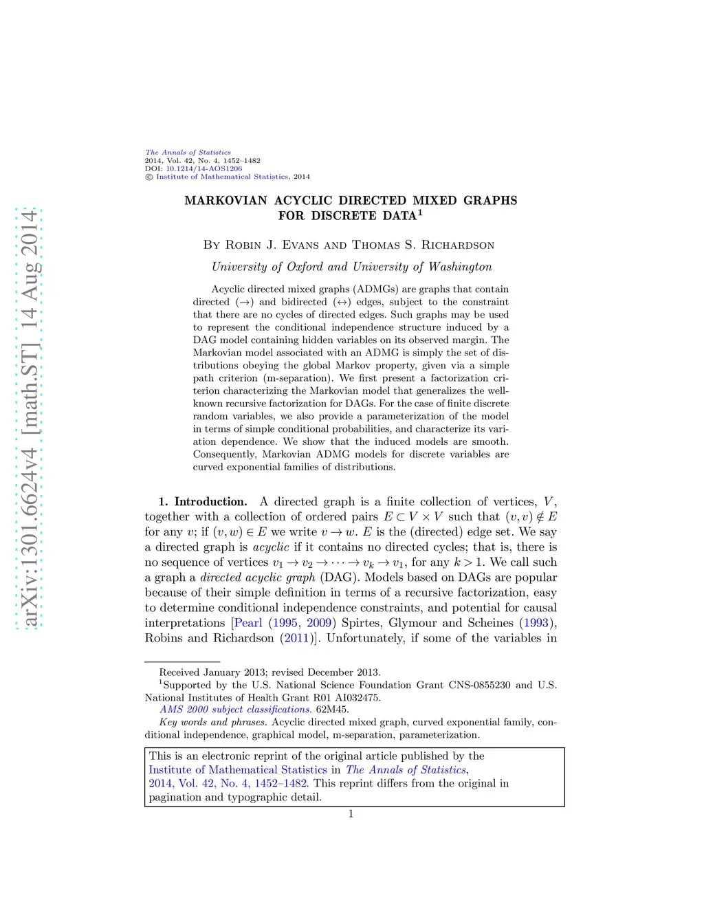 Acyclic directed mixed graphs (ADMGs) are graphs that contain directed () and bidirected () edges, subject to the constraint that there are no cycles of directed edges. Such graphs may be used to represent the conditional independence structure induced by a DAG model containing hidden variables on its observed margin. The Markovian model associated with an ADMG is simply the set of distributions obeying the global Markov property, given via a simple path criterion (m-separation). We first present a factorization criterion characterizing the Markovian model that generalizes the well-known recursive factorization for DAGs. For the case of finite discrete random variables, we also provide a parameterization of the model in terms of simple conditional probabilities, and characterize its variation dependence. We show that the induced models are smooth. Consequently, Markovian ADMG models for discrete variables are curved exponential families of distributions.