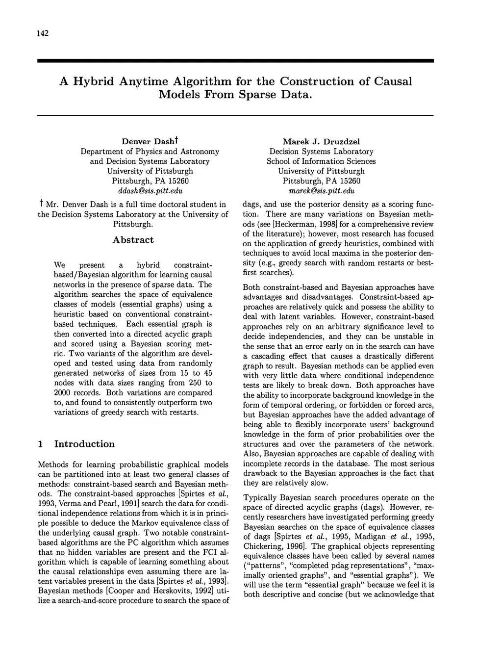 We present a hybrid constraint-based/Bayesian algorithm for learning causal networks in the presence of sparse data. The algorithm searches the space of equivalence classes of models (essential graphs) using a heuristic based on conventional constraint-based techniques. Each essential graph is then converted into a directed acyclic graph and scored using a Bayesian scoring metric. Two variants of the algorithm are developed and tested using data from randomly generated networks of sizes from 15 to 45 nodes with data sizes ranging from 250 to 2000 records. Both variations are compared to, and found to consistently outperform two variations of greedy search with restarts.