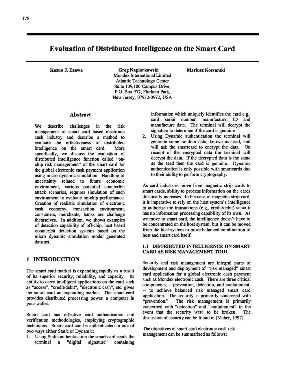We describe challenges in the risk management of smart card based electronic cash industry and describe a method to evaluate the effectiveness of distributed intelligence on the smart card. More specifically, we discuss the evaluation of distributed intelligence function called "on-chip risk management" of the smart card for the global electronic cash payment application using micro dynamic simulation. Handling of uncertainty related to future economic environment, various potential counterfeit attack scenarios, requires simulation of such environment to evaluate on-chip performance. Creation of realistic simulation of electronic cash economy, transaction environment, consumers, merchants, banks are challenge themselves. In addition, we shows examples of detection capability of off-chip, host based counterfeit detection systems based on the micro dynamic simulation model generated data set.