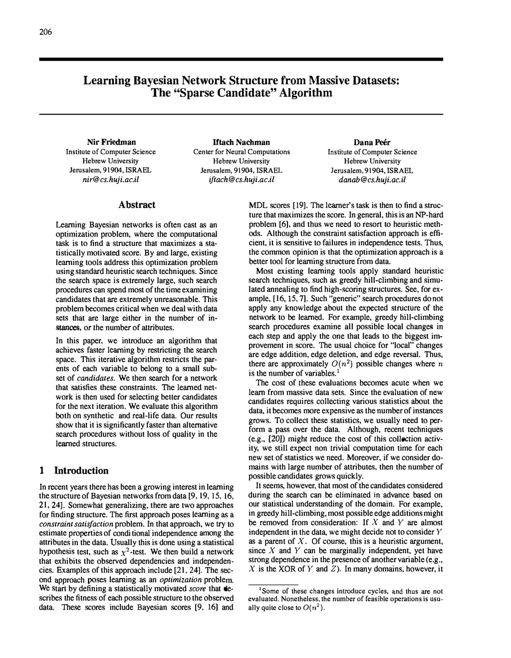 Learning Bayesian networks is often cast as an optimization problem, where the computational task is to find a structure that maximizes a statistically motivated score. By and large, existing learning tools address this optimization problem using standard heuristic search techniques. Since the search space is extremely large, such search procedures can spend most of the time examining candidates that are extremely unreasonable. This problem becomes critical when we deal with data sets that are large either in the number of instances, or the number of attributes. In this paper, we introduce an algorithm that achieves faster learning by restricting the search space. This iterative algorithm restricts the parents of each variable to belong to a small subset of candidates. We then search for a network that satisfies these constraints. The learned network is then used for selecting better candidates for the next iteration. We evaluate this algorithm both on synthetic and real-life data. Our results show that it is significantly faster than alternative search procedures without loss of quality in the learned structures.