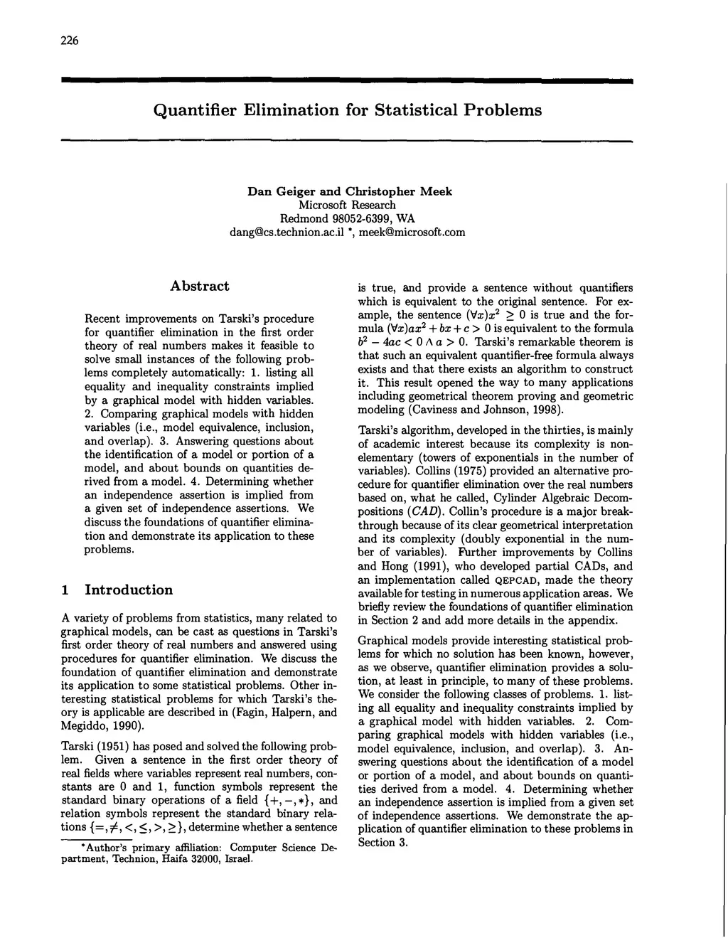 Recent improvement on Tarski's procedure for quantifier elimination in the first order theory of real numbers makes it feasible to solve small instances of the following problems completely automatically: 1. listing all equality and inequality constraints implied by a graphical model with hidden variables. 2. Comparing graphyical models with hidden variables (i.e., model equivalence, inclusion, and overlap). 3. Answering questions about the identification of a model or portion of a model, and about bounds on quantities derived from a model. 4. Determing whether a given set of independence assertions. We discuss the foundation of quantifier elimination and demonstrate its application to these problems.
