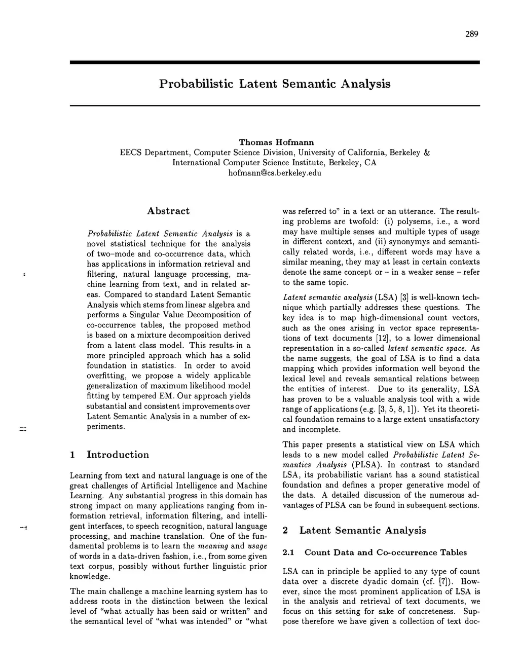 Probabilistic Latent Semantic Analysis is a novel statistical technique for the analysis of two-mode and co-occurrence data, which has applications in information retrieval and filtering, natural language processing, machine learning from text, and in related areas. Compared to standard Latent Semantic Analysis which stems from linear algebra and performs a Singular Value Decomposition of co-occurrence tables, the proposed method is based on a mixture decomposition derived from a latent class model. This results in a more principled approach which has a solid foundation in statistics. In order to avoid overfitting, we propose a widely applicable generalization of maximum likelihood model fitting by tempered EM. Our approach yields substantial and consistent improvements over Latent Semantic Analysis in a number of experiments.
