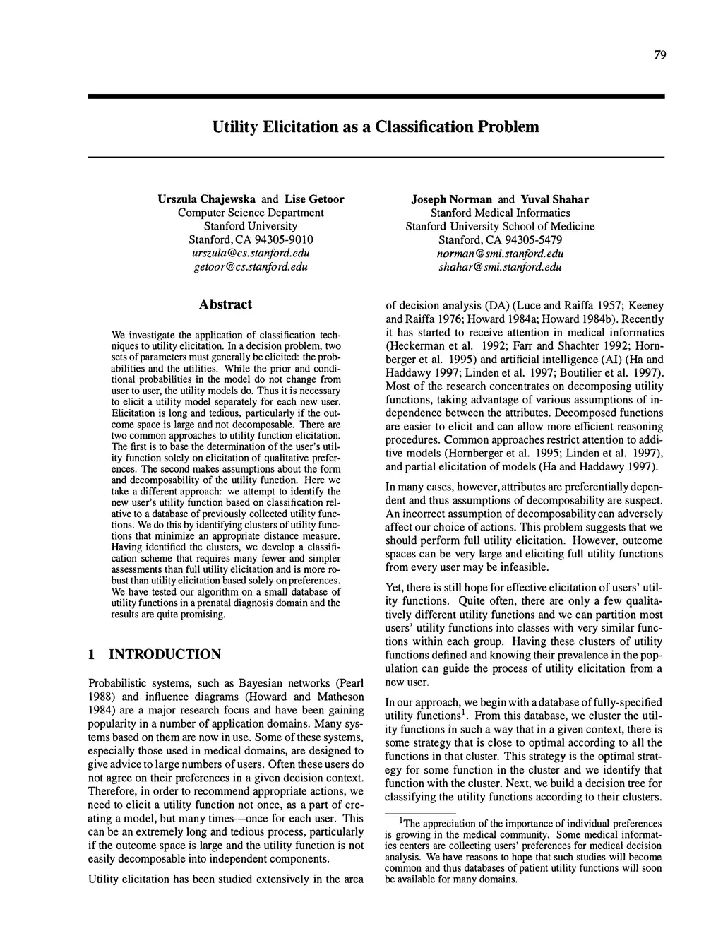We investigate the application of classification techniques to utility elicitation. In a decision problem, two sets of parameters must generally be elicited: the probabilities and the utilities. While the prior and conditional probabilities in the model do not change from user to user, the utility models do. Thus it is necessary to elicit a utility model separately for each new user. Elicitation is long and tedious, particularly if the outcome space is large and not decomposable. There are two common approaches to utility function elicitation. The first is to base the determination of the users utility function solely ON elicitation OF qualitative preferences.The second makes assumptions about the form AND decomposability OF the utility function.Here we take a different approach: we attempt TO identify the new USERs utility function based on classification relative to a database of previously collected utility functions. We do this by identifying clusters of utility functions that minimize an appropriate distance measure. Having identified the clusters, we develop a classification scheme that requires many fewer and simpler assessments than full utility elicitation and is more robust than utility elicitation based solely on preferences. We have tested our algorithm on a small database of utility functions in a prenatal diagnosis domain and the results are quite promising.