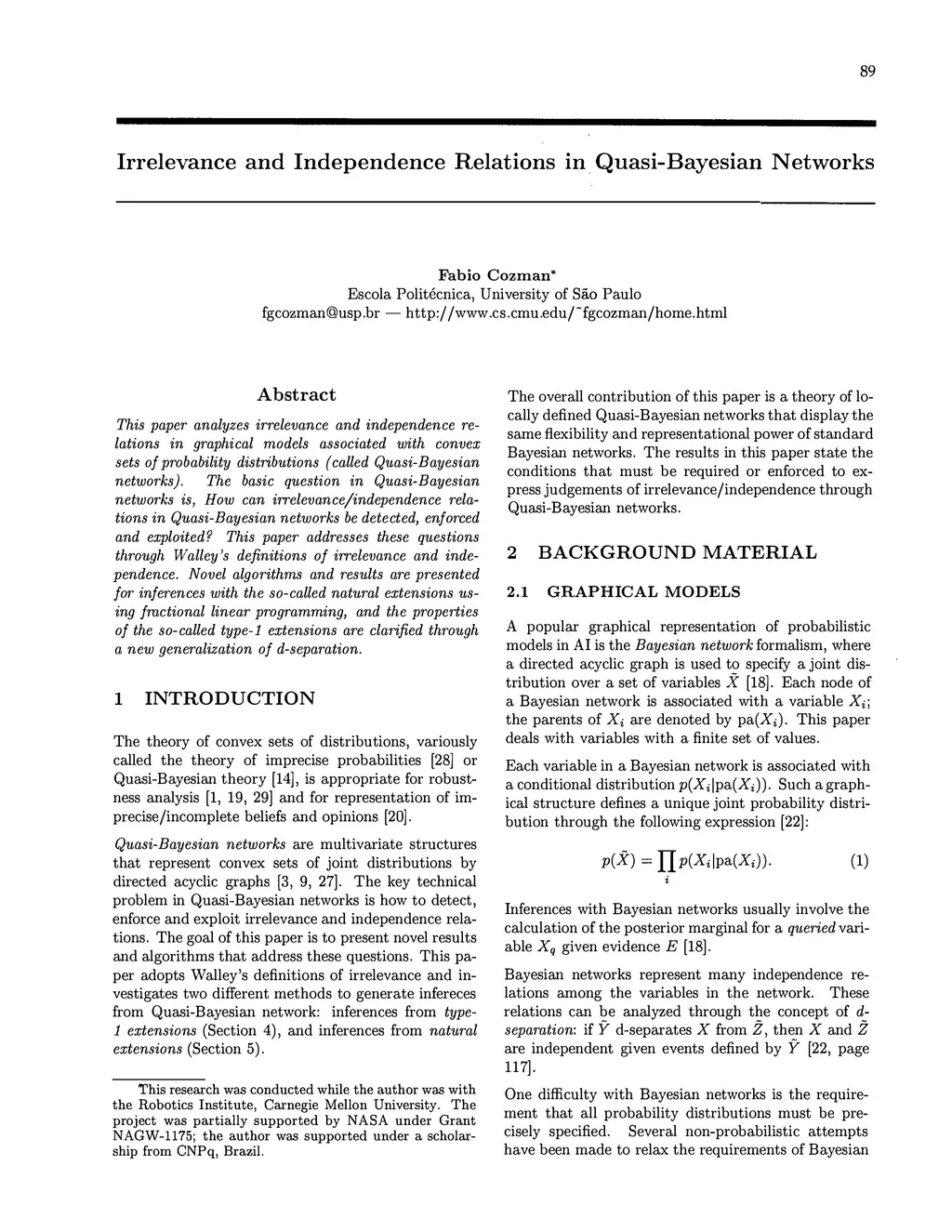 This paper analyzes irrelevance and independence relations in graphical models associated with convex sets of probability distributions (called Quasi-Bayesian networks). The basic question in Quasi-Bayesian networks is, How can irrelevance/independence relations in Quasi-Bayesian networks be detected, enforced and exploited? This paper addresses these questions through Walley's definitions of irrelevance and independence. Novel algorithms and results are presented for inferences with the so-called natural extensions using fractional linear programming, and the properties of the so-called type-1 extensions are clarified through a new generalization of d-separation.