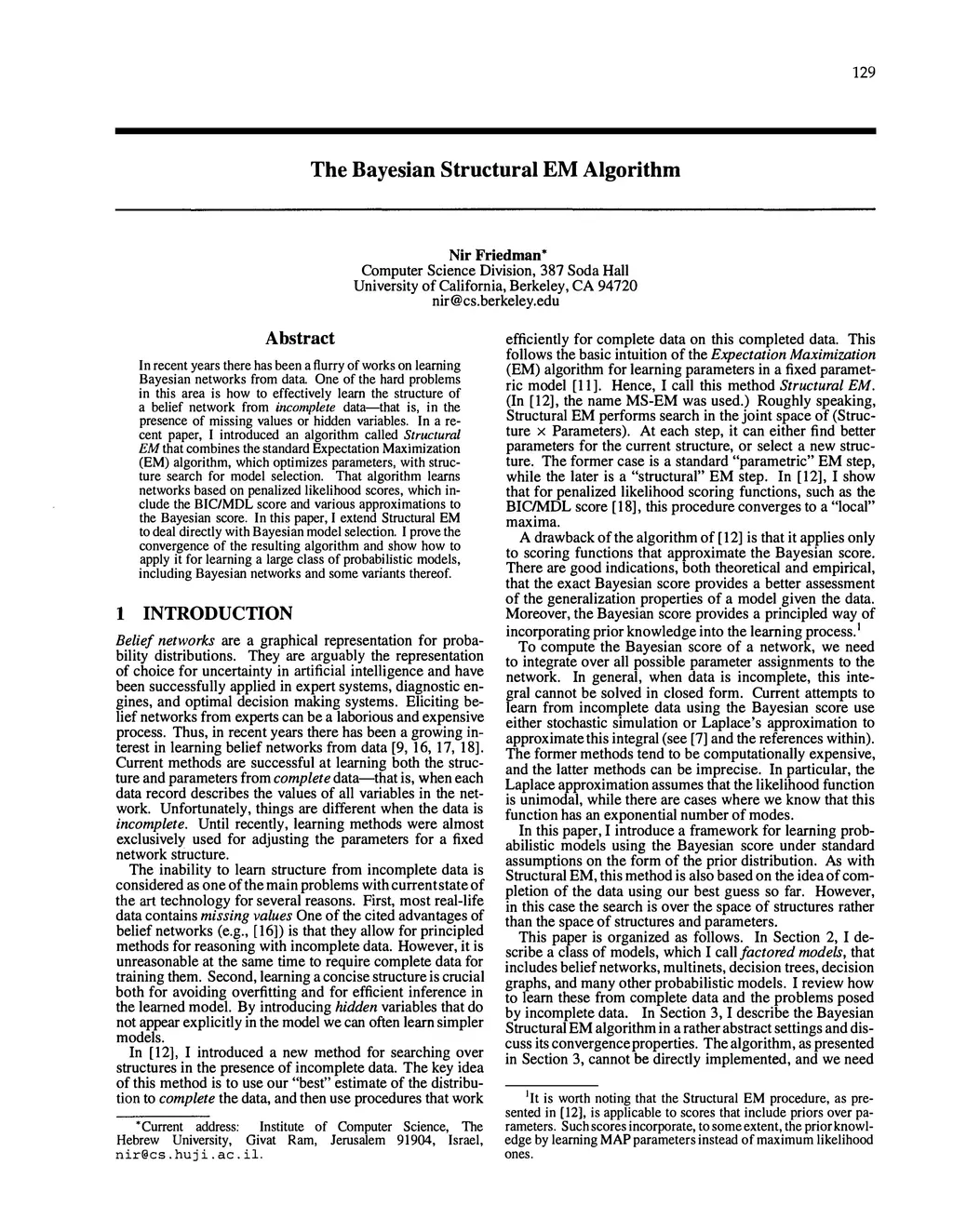 In recent years there has been a flurry of works on learning Bayesian networks from data. One of the hard problems in this area is how to effectively learn the structure of a belief network from incomplete data- that is, in the presence of missing values or hidden variables. In a recent paper, I introduced an algorithm called Structural EM that combines the standard Expectation Maximization (EM) algorithm, which optimizes parameters, with structure search for model selection. That algorithm learns networks based on penalized likelihood scores, which include the BIC/MDL score and various approximations to the Bayesian score. In this paper, I extend Structural EM to deal directly with Bayesian model selection. I prove the convergence of the resulting algorithm and show how to apply it for learning a large class of probabilistic models, including Bayesian networks and some variants thereof.