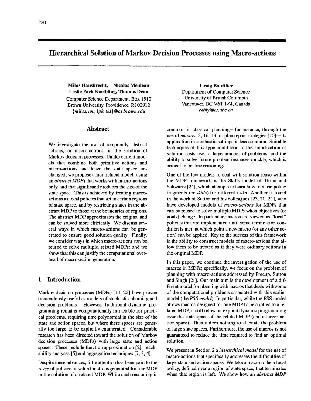 We investigate the use of temporally abstract actions, or macro-actions, in the solution of Markov decision processes. Unlike current models that combine both primitive actions and macro-actions and leave the state space unchanged, we propose a hierarchical model (using an abstract MDP) that works with macro-actions only, and that significantly reduces the size of the state space. This is achieved by treating macroactions as local policies that act in certain regions of state space, and by restricting states in the abstract MDP to those at the boundaries of regions. The abstract MDP approximates the original and can be solved more efficiently. We discuss several ways in which macro-actions can be generated to ensure good solution quality. Finally, we consider ways in which macro-actions can be reused to solve multiple, related MDPs; and we show that this can justify the computational overhead of macro-action generation.