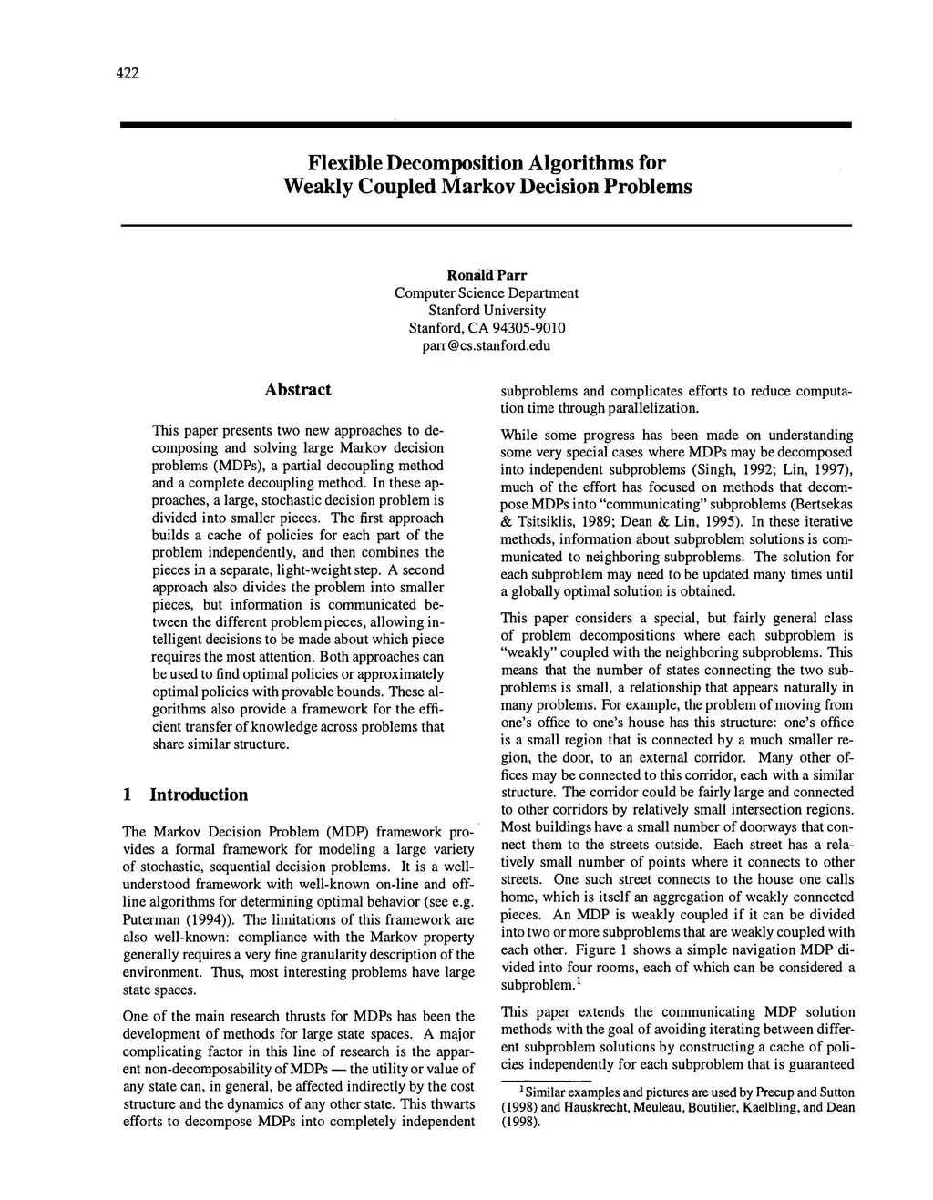 This paper presents two new approaches to decomposing and solving large Markov decision problems (MDPs), a partial decoupling method and a complete decoupling method. In these approaches, a large, stochastic decision problem is divided into smaller pieces. The first approach builds a cache of policies for each part of the problem independently, and then combines the pieces in a separate, light-weight step. A second approach also divides the problem into smaller pieces, but information is communicated between the different problem pieces, allowing intelligent decisions to be made about which piece requires the most attention. Both approaches can be used to find optimal policies or approximately optimal policies with provable bounds. These algorithms also provide a framework for the efficient transfer of knowledge across problems that share similar structure.