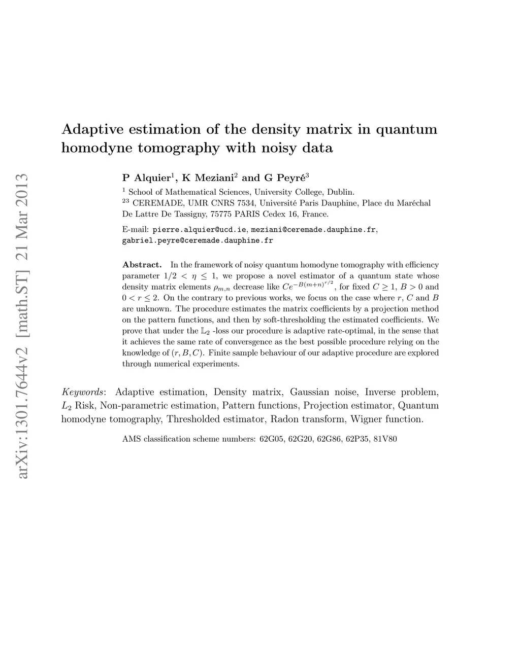 In the framework of noisy quantum homodyne tomography with efficiency parameter , we propose a novel estimator of a quantum state whose density matrix elements decrease like , for fixed , and . On the contrary to previous works, we focus on the case where , and are unknown. The procedure estimates the matrix coefficients by a projection method on the pattern functions, and then by soft-thresholding the estimated coefficients. We prove that under the -loss our procedure is adaptive rate-optimal, in the sense that it achieves the same rate of conversgence as the best possible procedure relying on the knowledge of . Finite sample behaviour of our adaptive procedure are explored through numerical experiments.
