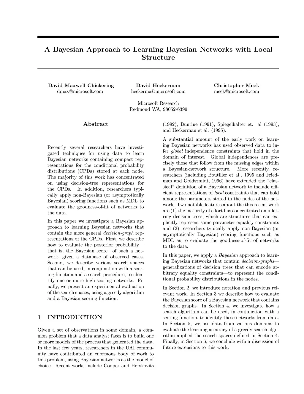 Recently several researchers have investigated techniques for using data to learn Bayesian networks containing compact representations for the conditional probability distributions (CPDs) stored at each node. The majority of this work has concentrated on using decision-tree representations for the CPDs. In addition, researchers typically apply non-Bayesian (or asymptotically Bayesian) scoring functions such as MDL to evaluate the goodness-of-fit of networks to the data. In this paper we investigate a Bayesian approach to learning Bayesian networks that contain the more general decision-graph representations of the CPDs. First, we describe how to evaluate the posterior probability that is, the Bayesian score of such a network, given a database of observed cases. Second, we describe various search spaces that can be used, in conjunction with a scoring function and a search procedure, to identify one or more high-scoring networks. Finally, we present an experimental evaluation of the search spaces, using a greedy algorithm and a Bayesian scoring function.
