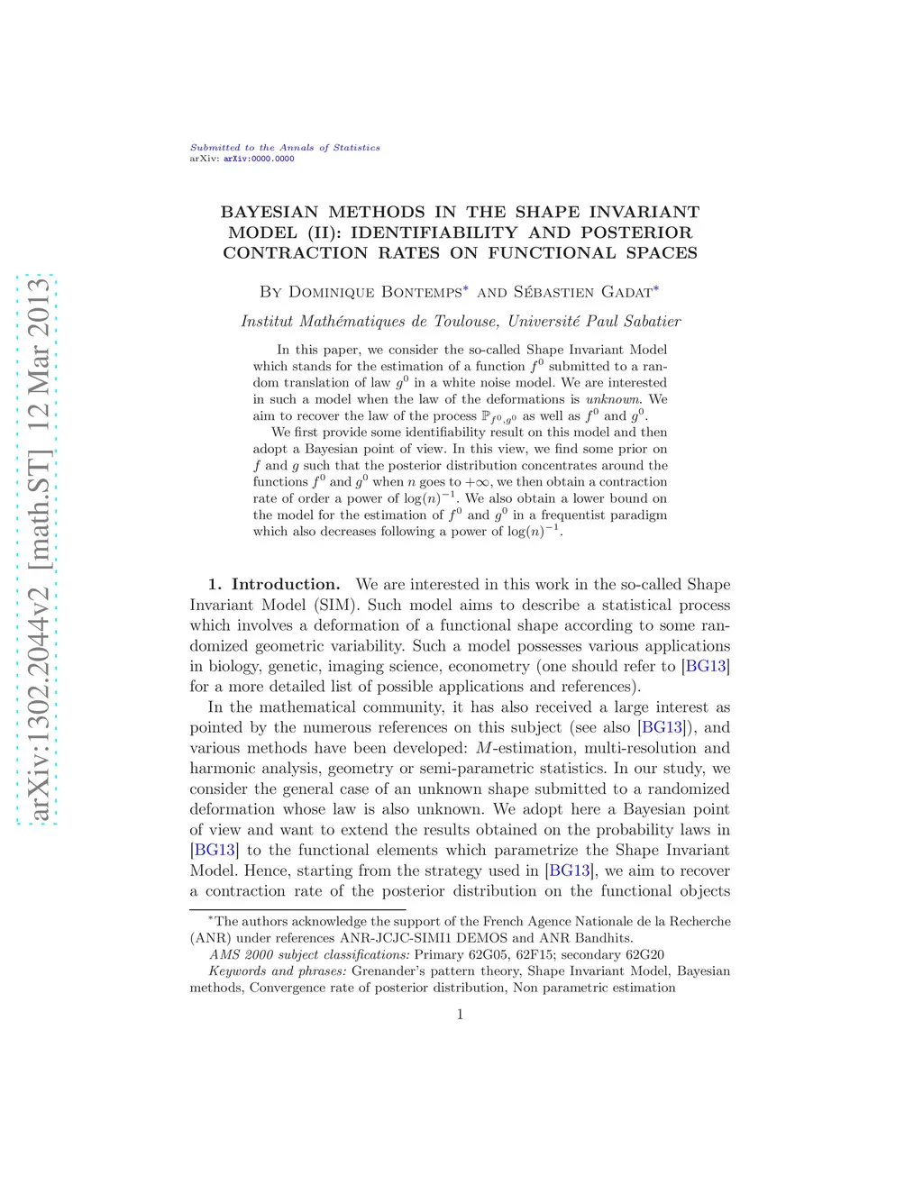 In this paper, we consider the so-called Shape Invariant Model which stands for the estimation of a function f0 submitted to a random translation of law g0 in a white noise model. We are interested in such a model when the law of the deformations is unknown. We aim to recover the law of the process P(f0,g0) as well as f0 and g0. We first provide some identifiability result on this model and then adopt a Bayesian point of view. In this view, we find some prior on f and g such that the posterior distribution concentrates around the functions f0 and g0 when n goes to infinity, we then obtain a contraction rate of order a power of log(n)^(-1). We also obtain a lower bound on the model for the estimation of f0 and g0 in a frequentist paradigm which also decreases following a power of log(n)^(-1).