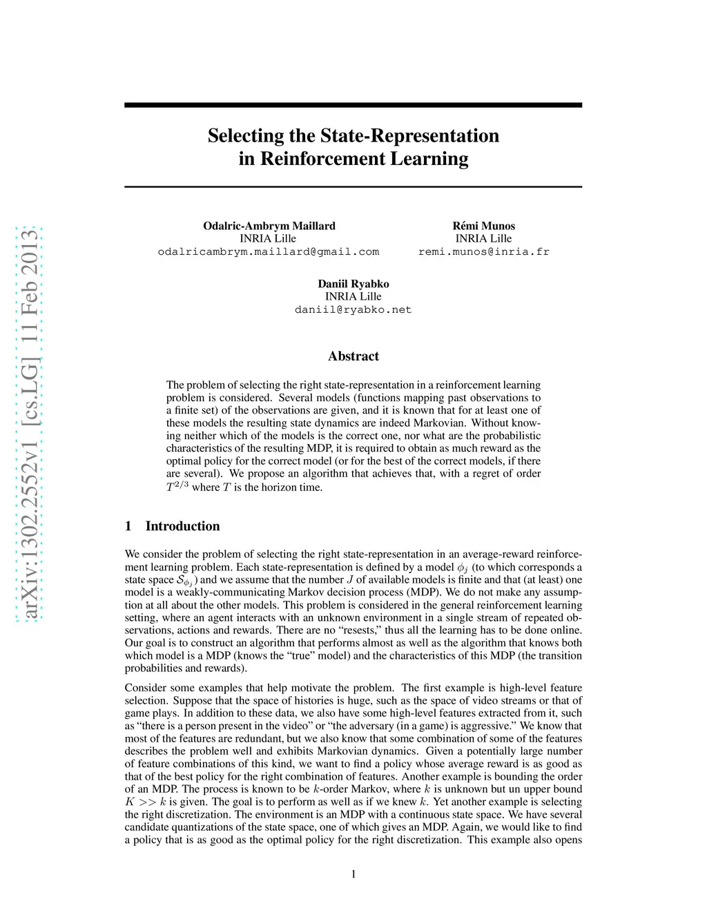 The problem of selecting the right state-representation in a reinforcement learning problem is considered. Several models (functions mapping past observations to a finite set) of the observations are given, and it is known that for at least one of these models the resulting state dynamics are indeed Markovian. Without knowing neither which of the models is the correct one, nor what are the probabilistic characteristics of the resulting MDP, it is required to obtain as much reward as the optimal policy for the correct model (or for the best of the correct models, if there are several). We propose an algorithm that achieves that, with a regret of order T^{2/3} where T is the horizon time.
