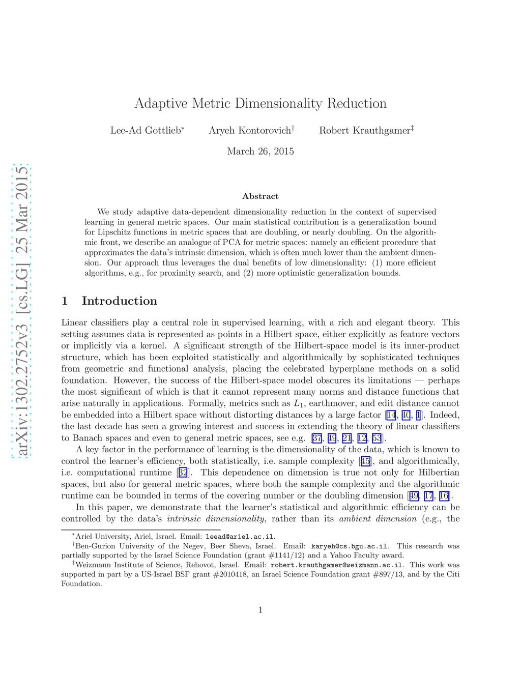 We study data-adaptive dimensionality reduction in the context of supervised learning in general metric spaces. Our main statistical contribution is a generalization bound for Lipschitz functions in metric spaces that are doubling, or nearly doubling, which yields a new theoretical explanation for empirically reported improvements gained by preprocessing Euclidean data by PCA (Principal Components Analysis) prior to constructing a linear classifier. On the algorithmic front, we describe an analogue of PCA for metric spaces, namely an efficient procedure that approximates the data's intrinsic dimension, which is often much lower than the ambient dimension. Our approach thus leverages the dual benefits of low dimensionality: (1) more efficient algorithms, e.g., for proximity search, and (2) more optimistic generalization bounds.