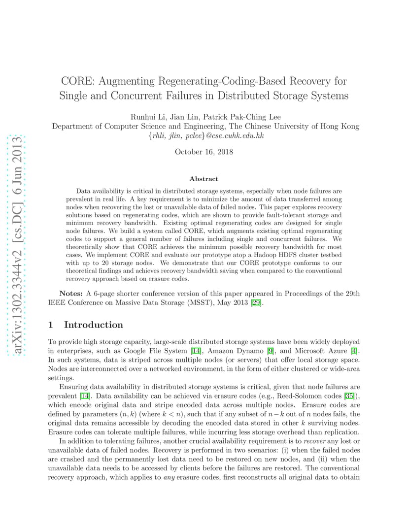 Data availability is critical in distributed storage systems, especially when node failures are prevalent in real life. A key requirement is to minimize the amount of data transferred among nodes when recovering the lost or unavailable data of failed nodes. This paper explores recovery solutions based on regenerating codes, which are shown to provide fault-tolerant storage and minimum recovery bandwidth. Existing optimal regenerating codes are designed for single node failures. We build a system called CORE, which augments existing optimal regenerating codes to support a general number of failures including single and concurrent failures. We theoretically show that CORE achieves the minimum possible recovery bandwidth for most cases. We implement CORE and evaluate our prototype atop a Hadoop HDFS cluster testbed with up to 20 storage nodes. We demonstrate that our CORE prototype conforms to our theoretical findings and achieves recovery bandwidth saving when compared to the conventional recovery approach based on erasure codes.