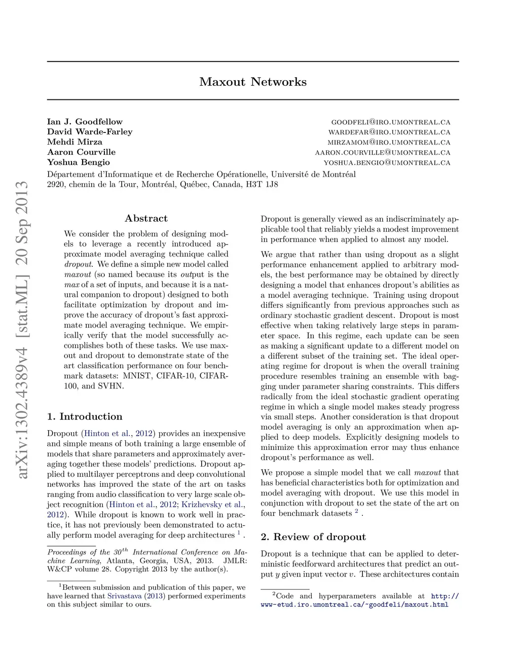 We consider the problem of designing models to leverage a recently introduced approximate model averaging technique called dropout. We define a simple new model called maxout (so named because its output is the max of a set of inputs, and because it is a natural companion to dropout) designed to both facilitate optimization by dropout and improve the accuracy of dropout's fast approximate model averaging technique. We empirically verify that the model successfully accomplishes both of these tasks. We use maxout and dropout to demonstrate state of the art classification performance on four benchmark datasets: MNIST, CIFAR-10, CIFAR-100, and SVHN.