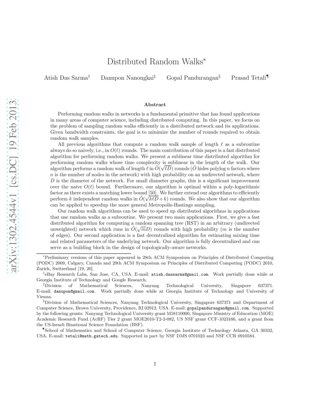 Performing random walks in networks is a fundamental primitive that has found applications in many areas of computer science, including distributed computing. In this paper, we focus on the problem of sampling random walks efficiently in a distributed network and its applications. Given bandwidth constraints, the goal is to minimize the number of rounds required to obtain random walk samples. All previous algorithms that compute a random walk sample of length as a subroutine always do so naively, i.e., in rounds. The main contribution of this paper is a fast distributed algorithm for performing random walks. We present a sublinear time distributed algorithm for performing random walks whose time complexity is sublinear in the length of the walk. Our algorithm performs a random walk of length in rounds ( hides factors where is the number of nodes in the network) with high probability on an undirected network, where is the diameter of the network. For small diameter graphs, this is a significant improvement over the naive bound. Furthermore, our algorithm is optimal within a poly-logarithmic factor as there exists a matching lower bound [Nanongkai et al. PODC 2011]. We further extend our algorithms to efficiently perform independent random walks in rounds. We also show that our algorithm can be applied to speedup the more general Metropolis-Hastings sampling. Our random walk algorithms can be used to speed up distributed algorithms in applications that use random walks as a subroutine, such as computing a random spanning tree and estimating mixing time and related parameters. Our algorithm is fully decentralized and can serve as a building block in the design of topologically-aware networks.