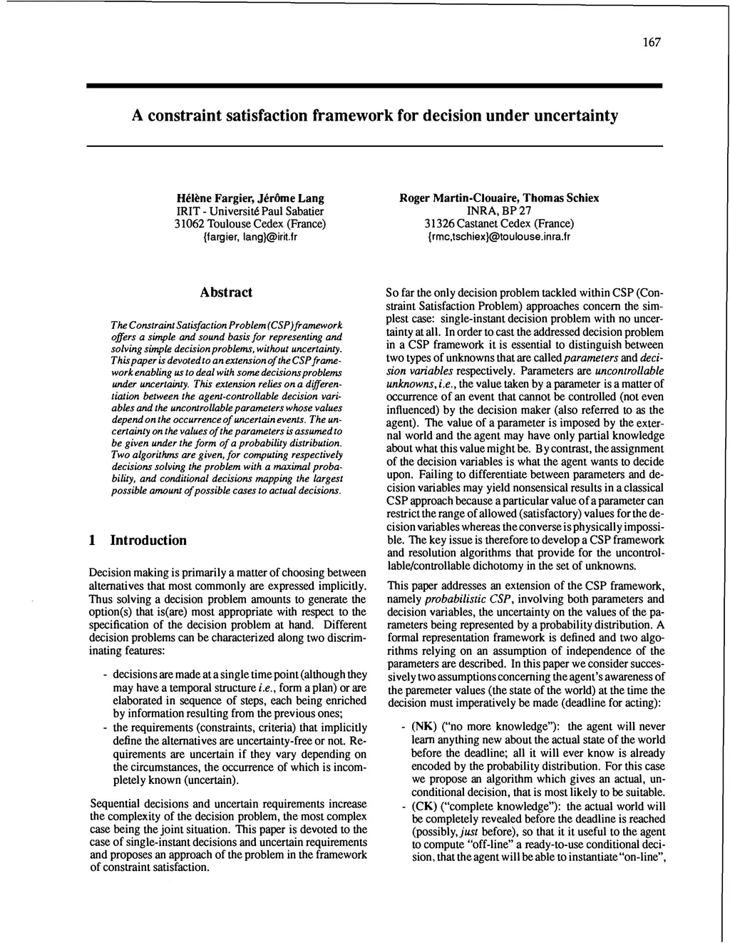 The Constraint Satisfaction Problem (CSP) framework offers a simple and sound basis for representing and solving simple decision problems, without uncertainty. This paper is devoted to an extension of the CSP framework enabling us to deal with some decisions problems under uncertainty. This extension relies on a differentiation between the agent-controllable decision variables and the uncontrollable parameters whose values depend on the occurrence of uncertain events. The uncertainty on the values of the parameters is assumed to be given under the form of a probability distribution. Two algorithms are given, for computing respectively decisions solving the problem with a maximal probability, and conditional decisions mapping the largest possible amount of possible cases to actual decisions.