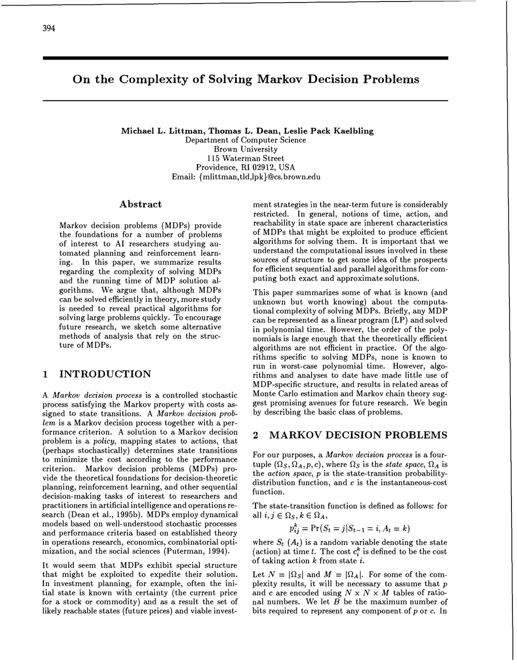 Markov decision problems (MDPs) provide the foundations for a number of problems of interest to AI researchers studying automated planning and reinforcement learning. In this paper, we summarize results regarding the complexity of solving MDPs and the running time of MDP solution algorithms. We argue that, although MDPs can be solved efficiently in theory, more study is needed to reveal practical algorithms for solving large problems quickly. To encourage future research, we sketch some alternative methods of analysis that rely on the structure of MDPs.