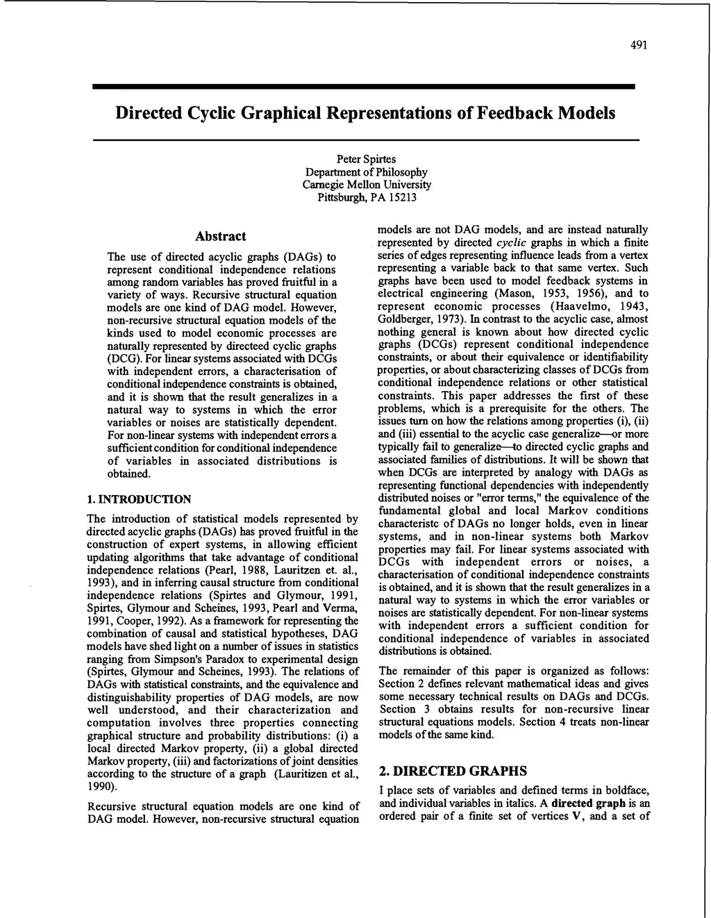 The use of directed acyclic graphs (DAGs) to represent conditional independence relations among random variables has proved fruitful in a variety of ways. Recursive structural equation models are one kind of DAG model. However, non-recursive structural equation models of the kinds used to model economic processes are naturally represented by directed cyclic graphs with independent errors, a characterization of conditional independence errors, a characterization of conditional independence constraints is obtained, and it is shown that the result generalizes in a natural way to systems in which the error variables or noises are statistically dependent. For non-linear systems with independent errors a sufficient condition for conditional independence of variables in associated distributions is obtained.