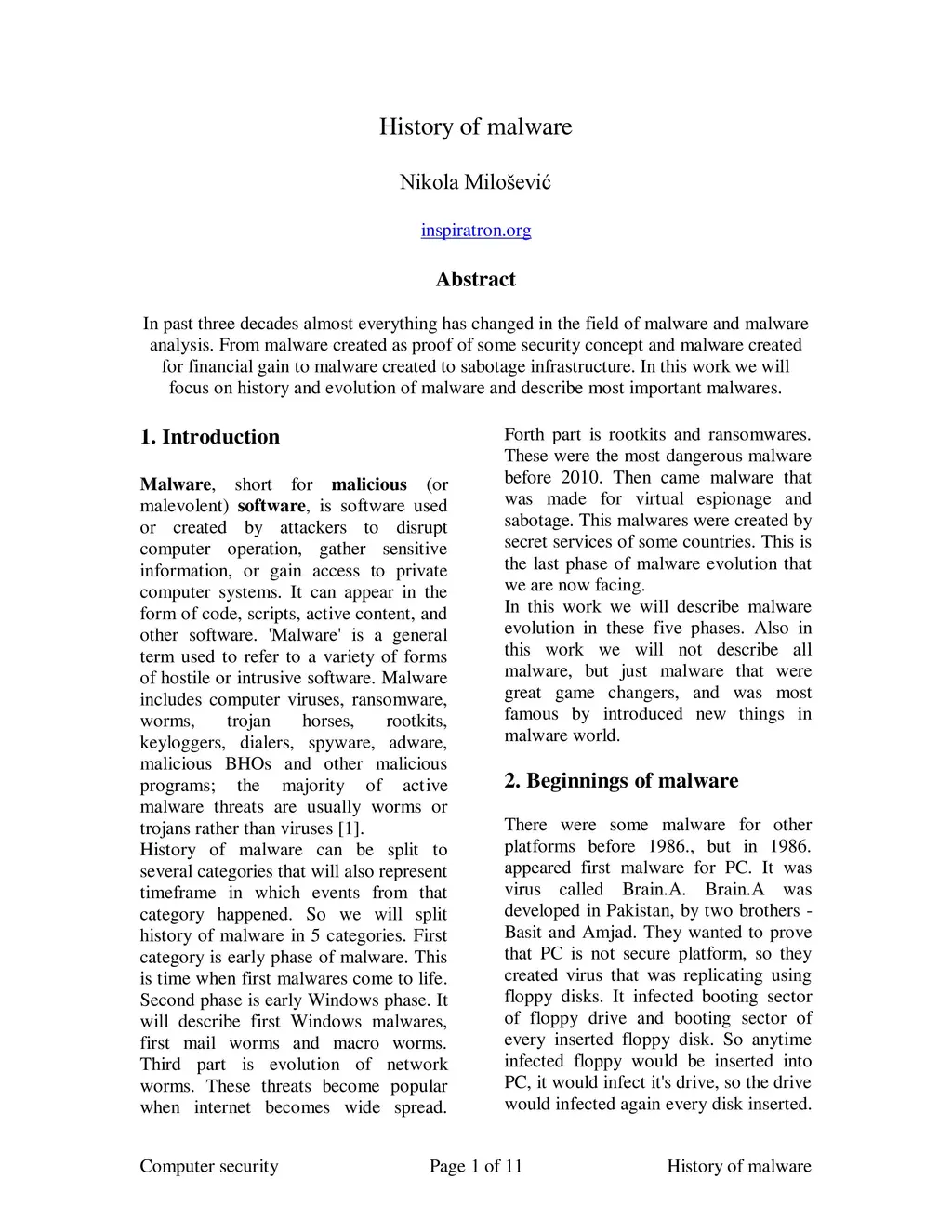 In past three decades almost everything has changed in the field of malware and malware analysis. From malware created as proof of some security concept and malware created for financial gain to malware created to sabotage infrastructure. In this work we will focus on history and evolution of malware and describe most important malwares.
