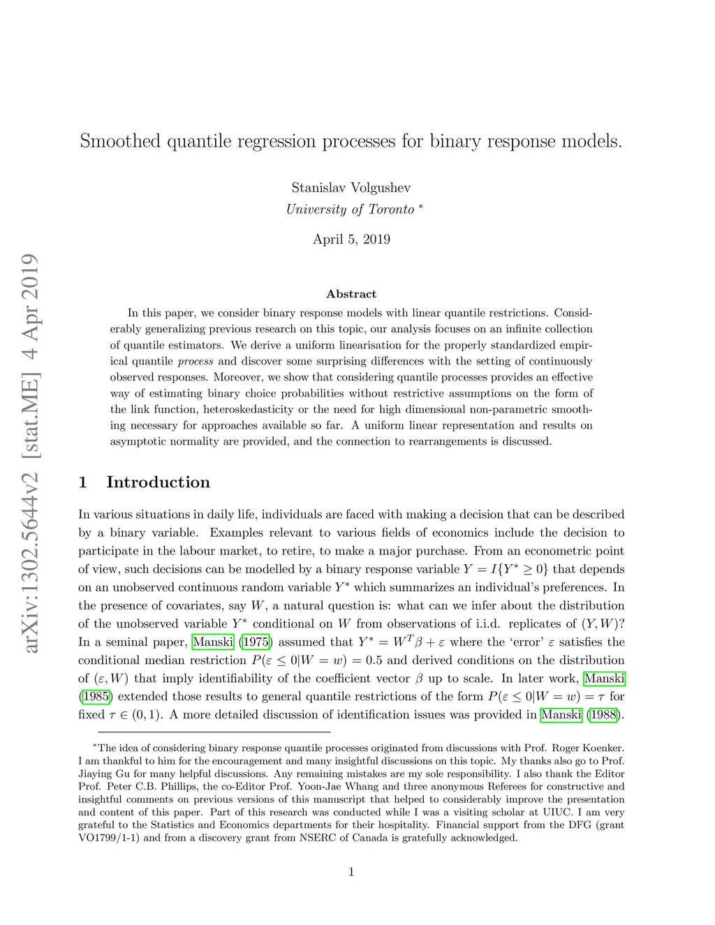 In this paper, we consider binary response models with linear quantile restrictions. Considerably generalizing previous research on this topic, our analysis focuses on an infinite collection of quantile estimators. We derive a uniform linearisation for the properly standardized empirical quantile process and discover some surprising differences with the setting of continuously observed responses. Moreover, we show that considering quantile processes provides an effective way of estimating binary choice probabilities without restrictive assumptions on the form of the link function, heteroskedasticity or the need for high dimensional non-parametric smoothing necessary for approaches available so far. A uniform linear representation and results on asymptotic normality are provided, and the connection to rearrangements is discussed.
