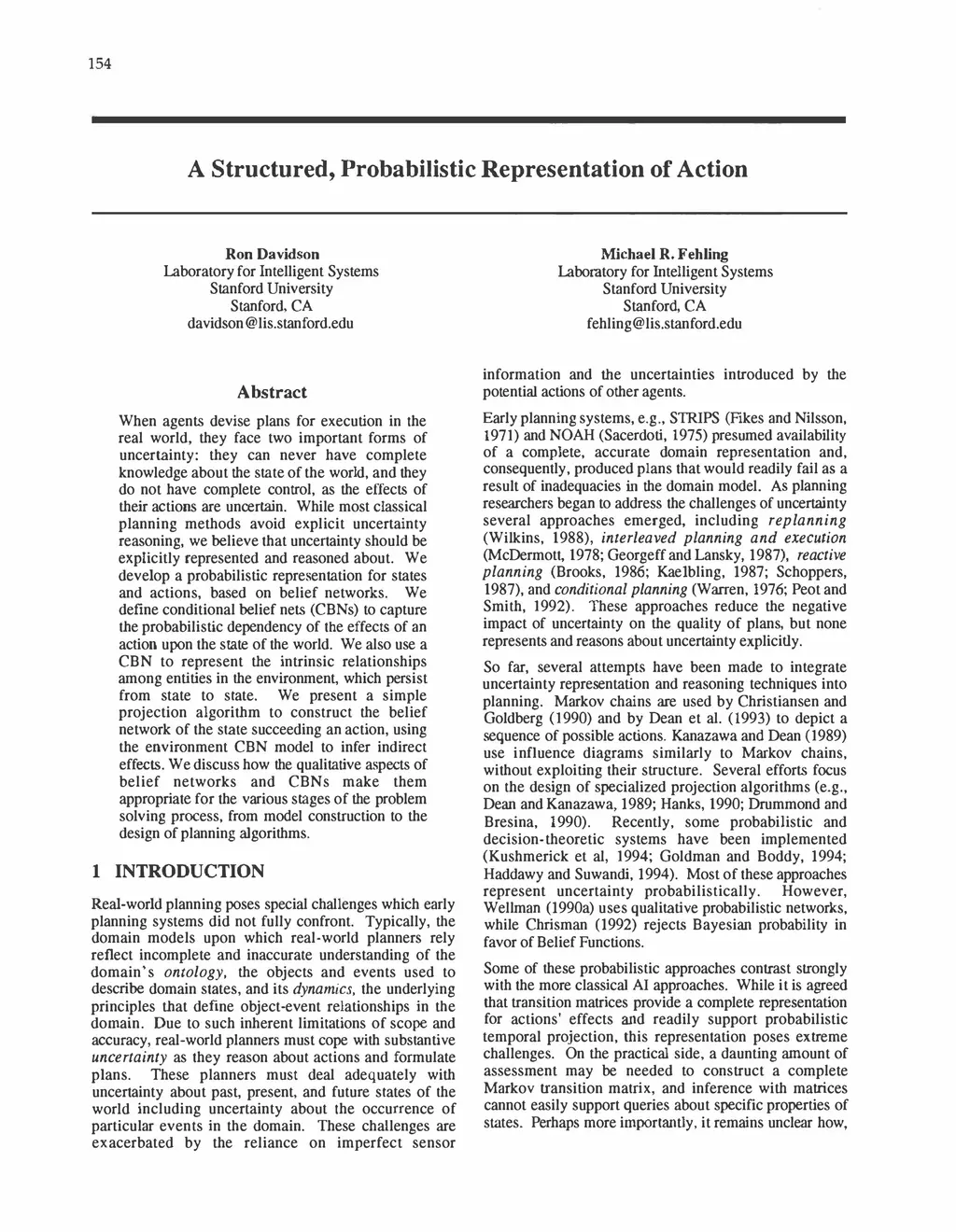 When agents devise plans for execution in the real world, they face two important forms of uncertainty: they can never have complete knowledge about the state of the world, and they do not have complete control, as the effects of their actions are uncertain. While most classical planning methods avoid explicit uncertainty reasoning, we believe that uncertainty should be explicitly represented and reasoned about. We develop a probabilistic representation for states and actions, based on belief networks. We define conditional belief nets (CBNs) to capture the probabilistic dependency of the effects of an action upon the state of the world. We also use a CBN to represent the intrinsic relationships among entities in the environment, which persist from state to state. We present a simple projection algorithm to construct the belief network of the state succeeding an action, using the environment CBN model to infer indirect effects. We discuss how the qualitative aspects of belief networks and CBNs make them appropriate for the various stages of the problem solving process, from model construction to the design of planning algorithms.
