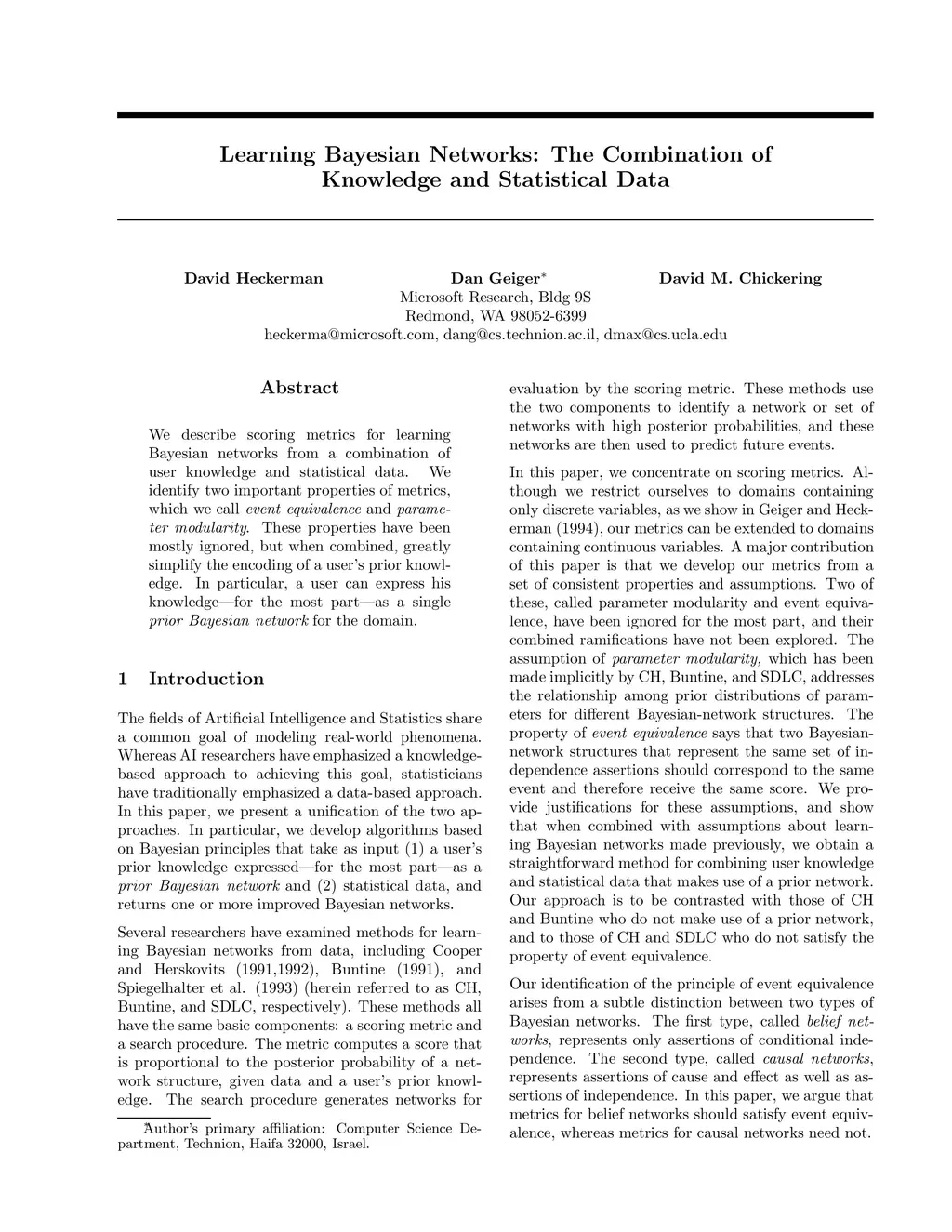 We describe algorithms for learning Bayesian networks from a combination of user knowledge and statistical data. The algorithms have two components: a scoring metric and a search procedure. The scoring metric takes a network structure, statistical data, and a user's prior knowledge, and returns a score proportional to the posterior probability of the network structure given the data. The search procedure generates networks for evaluation by the scoring metric. Our contributions are threefold. First, we identify two important properties of metrics, which we call event equivalence and parameter modularity. These properties have been mostly ignored, but when combined, greatly simplify the encoding of a user's prior knowledge. In particular, a user can express her knowledge-for the most part-as a single prior Bayesian network for the domain. Second, we describe local search and annealing algorithms to be used in conjunction with scoring metrics. In the special case where each node has at most one parent, we show that heuristic search can be replaced with a polynomial algorithm to identify the networks with the highest score. Third, we describe a methodology for evaluating Bayesian-network learning algorithms. We apply this approach to a comparison of metrics and search procedures.
