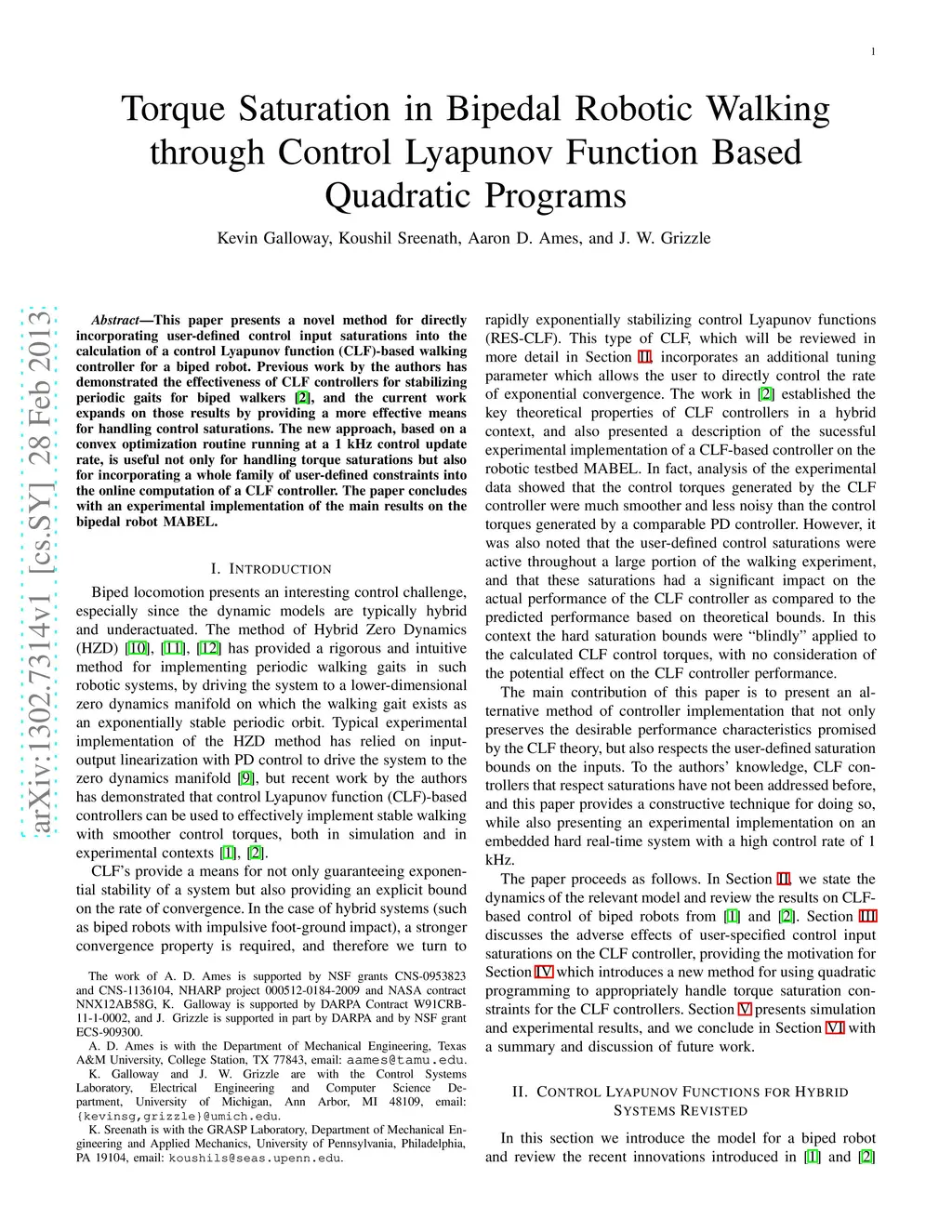 This paper presents a novel method for directly incorporating user-defined control input saturations into the calculation of a control Lyapunov function (CLF)-based walking controller for a biped robot. Previous work by the authors has demonstrated the effectiveness of CLF controllers for stabilizing periodic gaits for biped walkers, and the current work expands on those results by providing a more effective means for handling control saturations. The new approach, based on a convex optimization routine running at a 1 kHz control update rate, is useful not only for handling torque saturations but also for incorporating a whole family of user-defined constraints into the online computation of a CLF controller. The paper concludes with an experimental implementation of the main results on the bipedal robot MABEL.