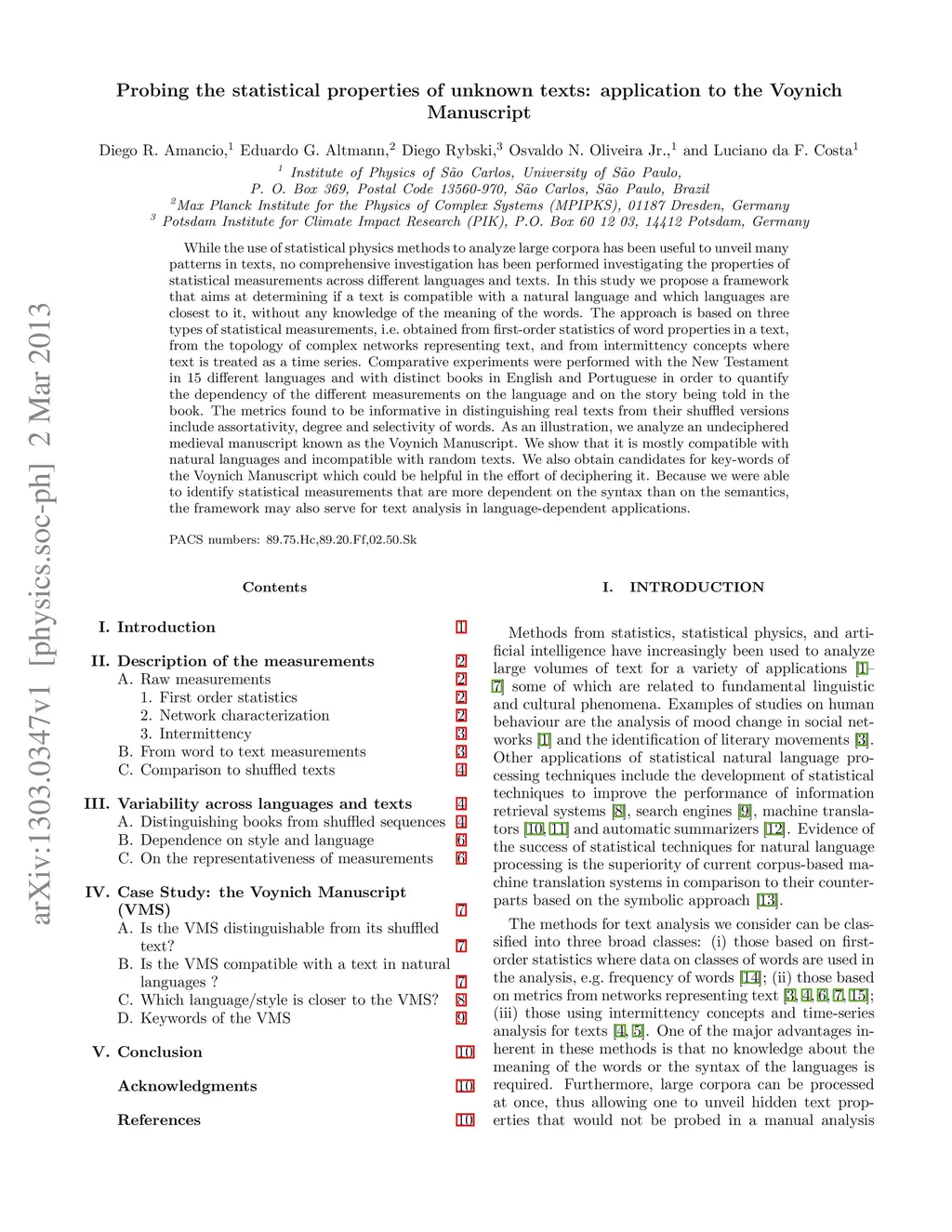 While the use of statistical physics methods to analyze large corpora has been useful to unveil many patterns in texts, no comprehensive investigation has been performed investigating the properties of statistical measurements across different languages and texts. In this study we propose a framework that aims at determining if a text is compatible with a natural language and which languages are closest to it, without any knowledge of the meaning of the words. The approach is based on three types of statistical measurements, i.e. obtained from first-order statistics of word properties in a text, from the topology of complex networks representing text, and from intermittency concepts where text is treated as a time series. Comparative experiments were performed with the New Testament in 15 different languages and with distinct books in English and Portuguese in order to quantify the dependency of the different measurements on the language and on the story being told in the book. The metrics found to be informative in distinguishing real texts from their shuffled versions include assortativity, degree and selectivity of words. As an illustration, we analyze an undeciphered medieval manuscript known as the Voynich Manuscript. We show that it is mostly compatible with natural languages and incompatible with random texts. We also obtain candidates for key-words of the Voynich Manuscript which could be helpful in the effort of deciphering it. Because we were able to identify statistical measurements that are more dependent on the syntax than on the semantics, the framework may also serve for text analysis in language-dependent applications.