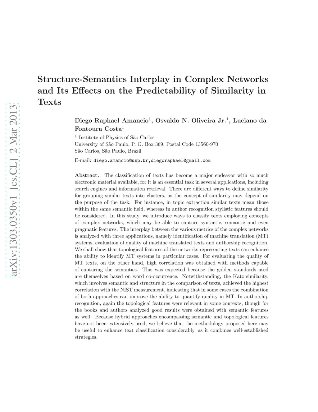 There are different ways to define similarity for grouping similar texts into clusters, as the concept of similarity may depend on the purpose of the task. For instance, in topic extraction similar texts mean those within the same semantic field, whereas in author recognition stylistic features should be considered. In this study, we introduce ways to classify texts employing concepts of complex networks, which may be able to capture syntactic, semantic and even pragmatic features. The interplay between the various metrics of the complex networks is analyzed with three applications, namely identification of machine translation (MT) systems, evaluation of quality of machine translated texts and authorship recognition. We shall show that topological features of the networks representing texts can enhance the ability to identify MT systems in particular cases. For evaluating the quality of MT texts, on the other hand, high correlation was obtained with methods capable of capturing the semantics. This was expected because the golden standards used are themselves based on word co-occurrence. Notwithstanding, the Katz similarity, which involves semantic and structure in the comparison of texts, achieved the highest correlation with the NIST measurement, indicating that in some cases the combination of both approaches can improve the ability to quantify quality in MT. In authorship recognition, again the topological features were relevant in some contexts, though for the books and authors analyzed good results were obtained with semantic features as well. Because hybrid approaches encompassing semantic and topological features have not been extensively used, we believe that the methodology proposed here may be useful to enhance text classification considerably, as it combines well-established strategies.