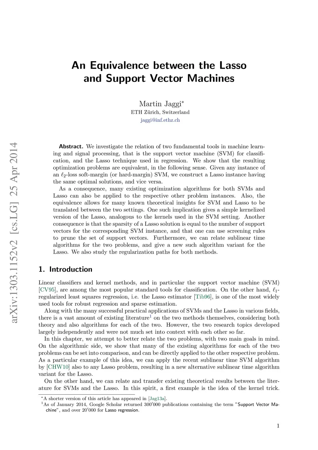 We investigate the relation of two fundamental tools in machine learning and signal processing, that is the support vector machine (SVM) for classification, and the Lasso technique used in regression. We show that the resulting optimization problems are equivalent, in the following sense. Given any instance of an -loss soft-margin (or hard-margin) SVM, we construct a Lasso instance having the same optimal solutions, and vice versa. As a consequence, many existing optimization algorithms for both SVMs and Lasso can also be applied to the respective other problem instances. Also, the equivalence allows for many known theoretical insights for SVM and Lasso to be translated between the two settings. One such implication gives a simple kernelized version of the Lasso, analogous to the kernels used in the SVM setting. Another consequence is that the sparsity of a Lasso solution is equal to the number of support vectors for the corresponding SVM instance, and that one can use screening rules to prune the set of support vectors. Furthermore, we can relate sublinear time algorithms for the two problems, and give a new such algorithm variant for the Lasso. We also study the regularization paths for both methods.