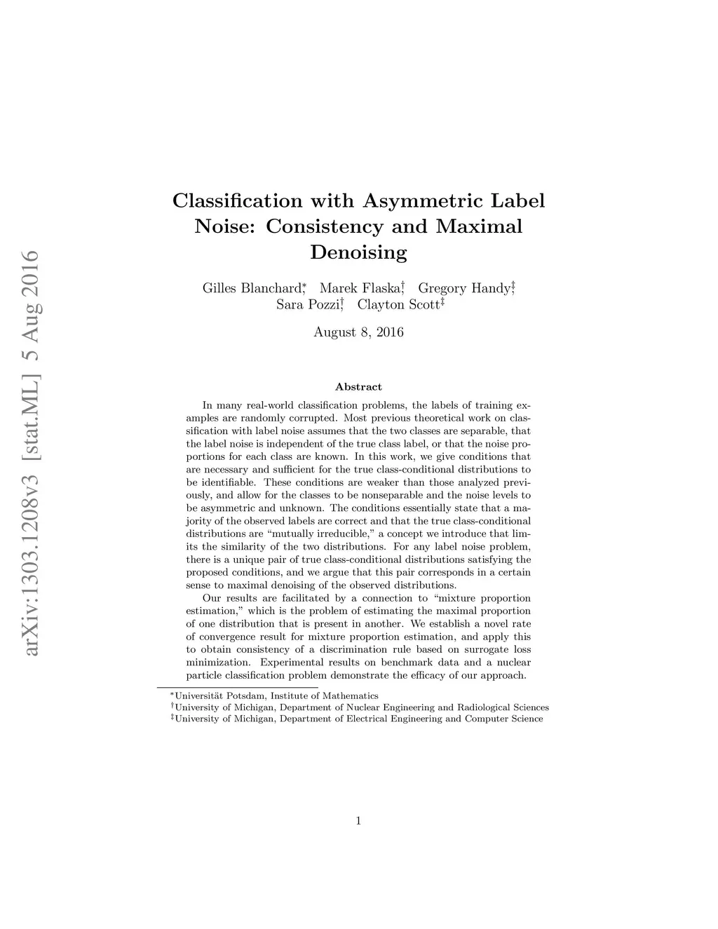 In many real-world classification problems, the labels of training examples are randomly corrupted. Most previous theoretical work on classification with label noise assumes that the two classes are separable, that the label noise is independent of the true class label, or that the noise proportions for each class are known. In this work, we give conditions that are necessary and sufficient for the true class-conditional distributions to be identifiable. These conditions are weaker than those analyzed previously, and allow for the classes to be nonseparable and the noise levels to be asymmetric and unknown. The conditions essentially state that a majority of the observed labels are correct and that the true class-conditional distributions are "mutually irreducible," a concept we introduce that limits the similarity of the two distributions. For any label noise problem, there is a unique pair of true class-conditional distributions satisfying the proposed conditions, and we argue that this pair corresponds in a certain sense to maximal denoising of the observed distributions. Our results are facilitated by a connection to "mixture proportion estimation," which is the problem of estimating the maximal proportion of one distribution that is present in another. We establish a novel rate of convergence result for mixture proportion estimation, and apply this to obtain consistency of a discrimination rule based on surrogate loss minimization. Experimental results on benchmark data and a nuclear particle classification problem demonstrate the efficacy of our approach.