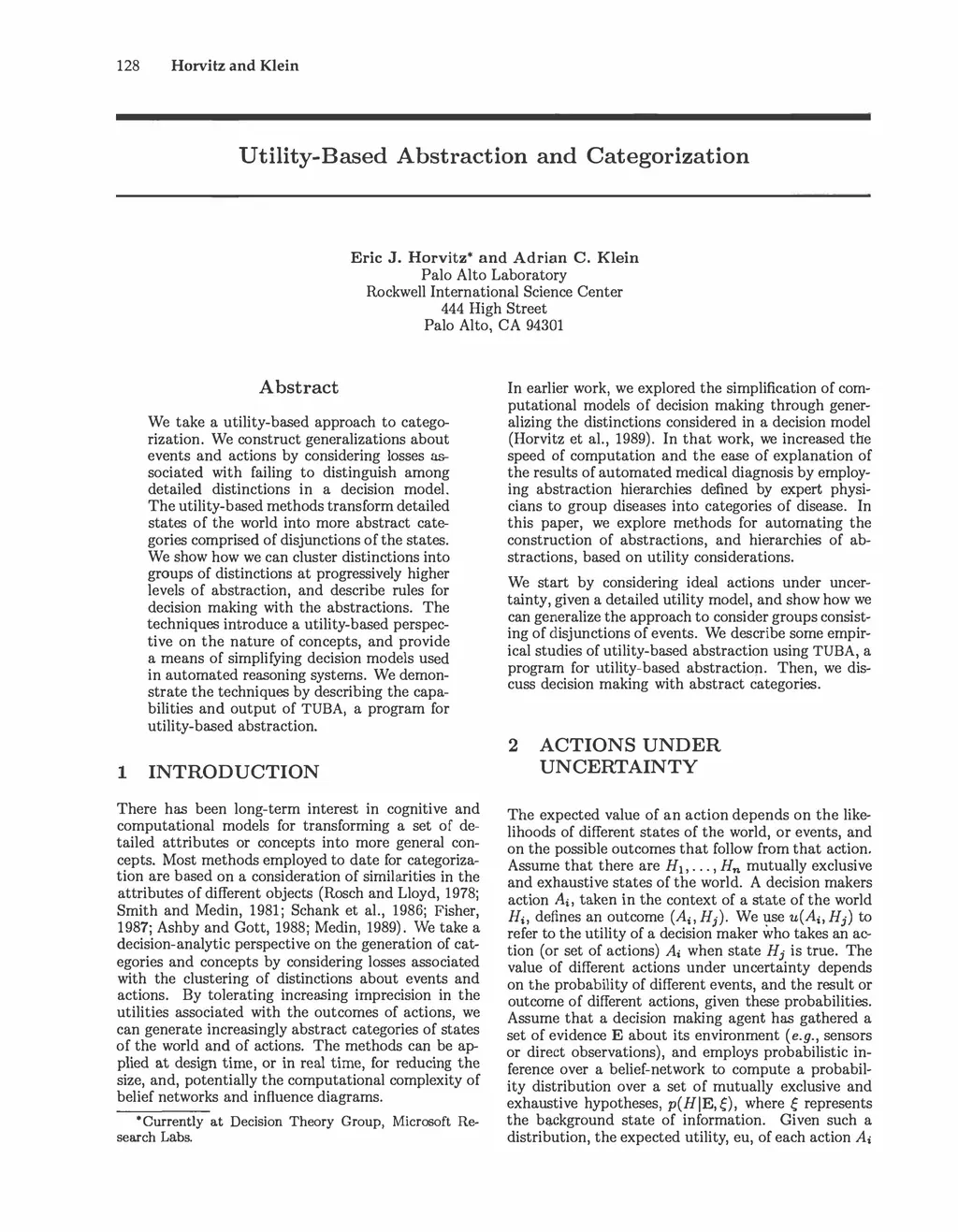 We take a utility-based approach to categorization. We construct generalizations about events and actions by considering losses associated with failing to distinguish among detailed distinctions in a decision model. The utility-based methods transform detailed states of the world into more abstract categories comprised of disjunctions of the states. We show how we can cluster distinctions into groups of distinctions at progressively higher levels of abstraction, and describe rules for decision making with the abstractions. The techniques introduce a utility-based perspective on the nature of concepts, and provide a means of simplifying decision models used in automated reasoning systems. We demonstrate the techniques by describing the capabilities and output of TUBA, a program for utility-based abstraction.