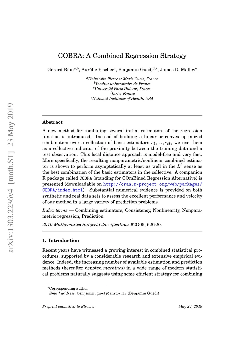 A new method for combining several initial estimators of the regression function is introduced. Instead of building a linear or convex optimized combination over a collection of basic estimators , we use them as a collective indicator of the proximity between the training data and a test observation. This local distance approach is model-free and very fast. More specifically, the resulting nonparametric/nonlinear combined estimator is shown to perform asymptotically at least as well in the sense as the best combination of the basic estimators in the collective. A companion R package called \cobra (standing for COmBined Regression Alternative) is presented (downloadable on \url{http://cran.r-project.org/web/packages/COBRA/index.html}). Substantial numerical evidence is provided on both synthetic and real data sets to assess the excellent performance and velocity of our method in a large variety of prediction problems.