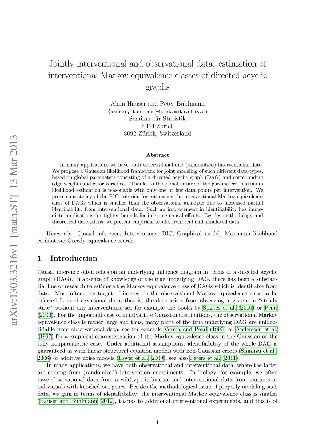In many applications we have both observational and (randomized) interventional data. We propose a Gaussian likelihood framework for joint modeling of such different data-types, based on global parameters consisting of a directed acyclic graph (DAG) and correponding edge weights and error variances. Thanks to the global nature of the parameters, maximum likelihood estimation is reasonable with only one or few data points per intervention. We prove consistency of the BIC criterion for estimating the interventional Markov equivalence class of DAGs which is smaller than the observational analogue due to increased partial identifiability from interventional data. Such an improvement in identifiability has immediate implications for tighter bounds for inferring causal effects. Besides methodology and theoretical derivations, we present empirical results from real and simulated data.
