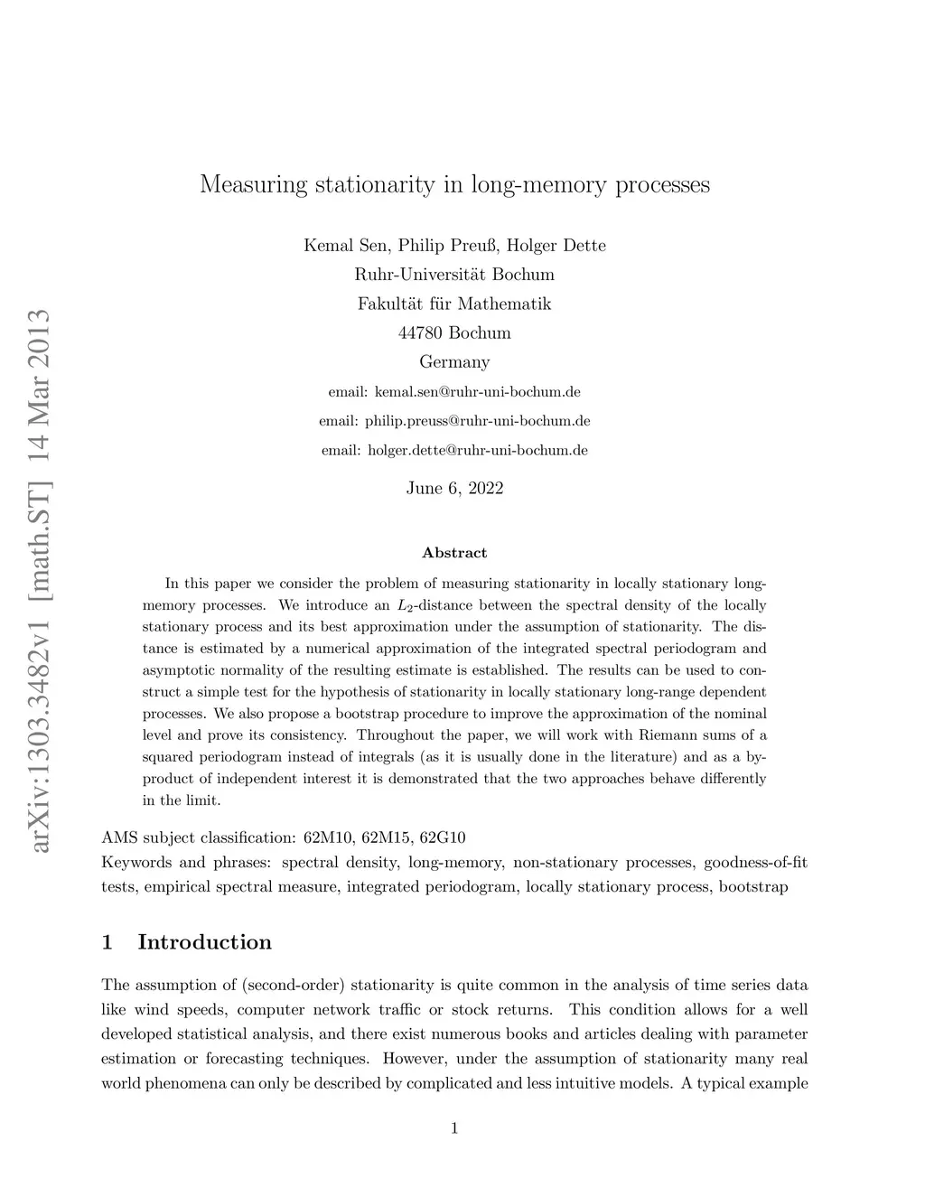In this paper we consider the problem of measuring stationarity in locally stationary long-memory processes. We introduce an -distance between the spectral density of the locally stationary process and its best approximation under the assumption of stationarity. The distance is estimated by a numerical approximation of the integrated spectral periodogram and asymptotic normality of the resulting estimate is established. The results can be used to construct a simple test for the hypothesis of stationarity in locally stationary long-range dependent processes. We also propose a bootstrap procedure to improve the approximation of the nominal level and prove its consistency. Throughout the paper, we will work with Riemann sums of a squared periodogram instead of integrals (as it is usually done in the literature) and as a by-product of independent interest it is demonstrated that the two approaches behave differently in the limit.