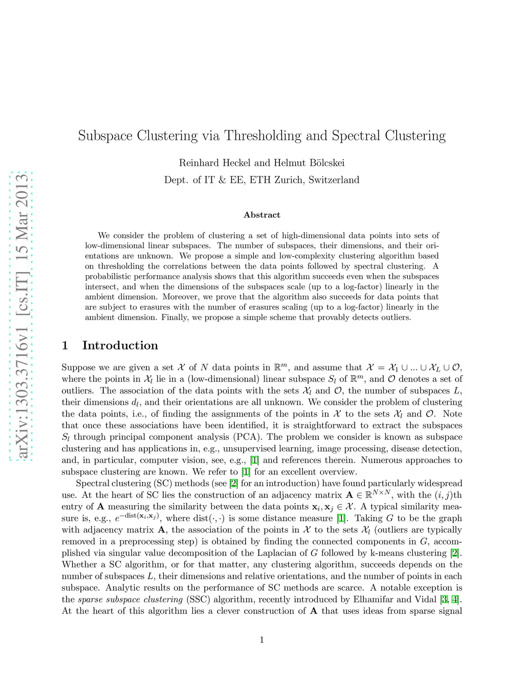We consider the problem of clustering a set of high-dimensional data points into sets of low-dimensional linear subspaces. The number of subspaces, their dimensions, and their orientations are unknown. We propose a simple and low-complexity clustering algorithm based on thresholding the correlations between the data points followed by spectral clustering. A probabilistic performance analysis shows that this algorithm succeeds even when the subspaces intersect, and when the dimensions of the subspaces scale (up to a log-factor) linearly in the ambient dimension. Moreover, we prove that the algorithm also succeeds for data points that are subject to erasures with the number of erasures scaling (up to a log-factor) linearly in the ambient dimension. Finally, we propose a simple scheme that provably detects outliers.