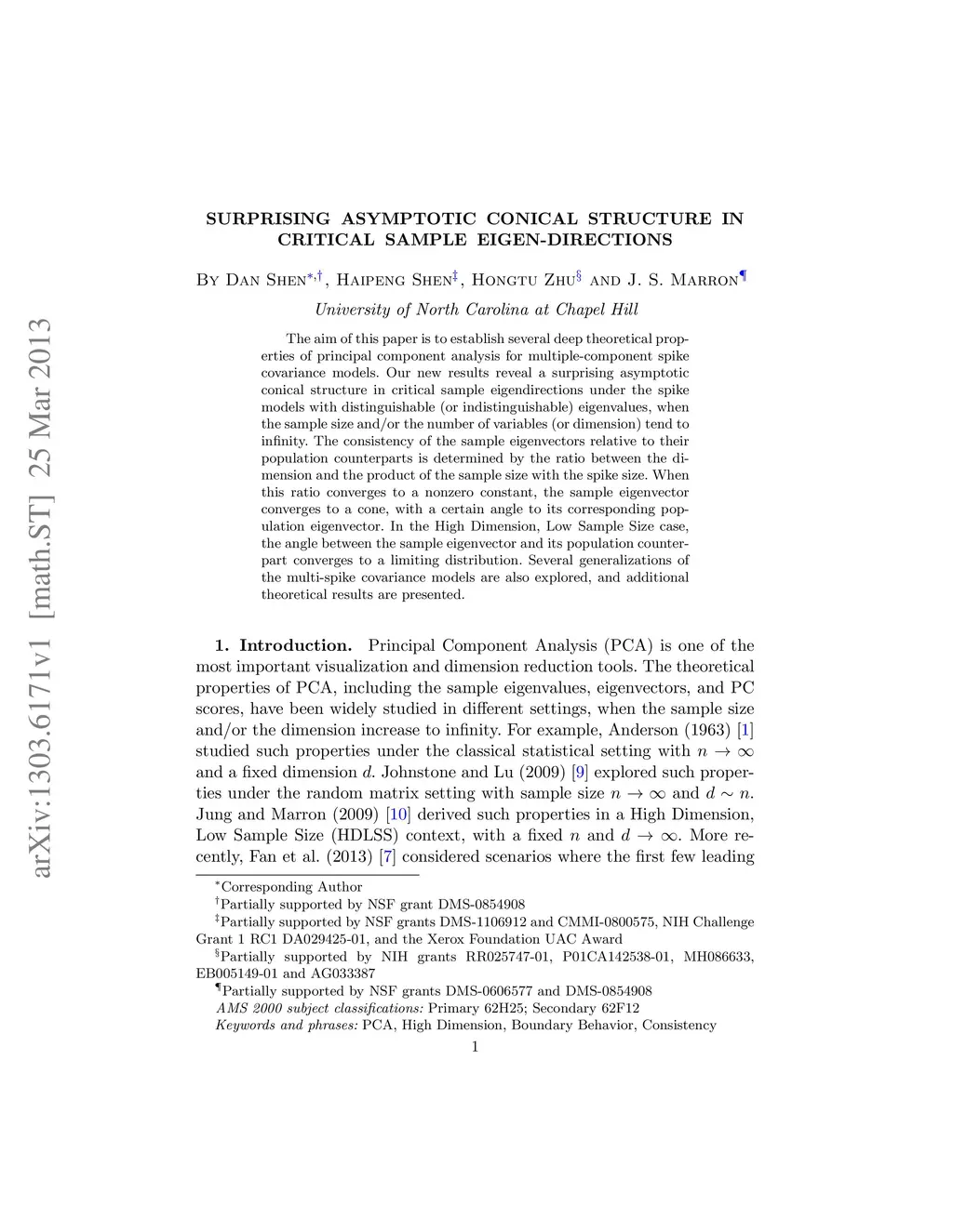 The aim of this paper is to establish several deep theoretical properties of principal component analysis for multiple-component spike covariance models. Our new results reveal a surprising asymptotic conical structure in critical sample eigendirections under the spike models with distinguishable (or indistinguishable) eigenvalues, when the sample size and/or the number of variables (or dimension) tend to infinity. The consistency of the sample eigenvectors relative to their population counterparts is determined by the ratio between the dimension and the product of the sample size with the spike size. When this ratio converges to a nonzero constant, the sample eigenvector converges to a cone, with a certain angle to its corresponding population eigenvector.In the High Dimension, Low Sample Size case, the angle between the sample eigenvector and its population counterpart converges to a limiting distribution.Several generalizations of the multi-spike covariance models are also explored, and additional theoretical results are presented.