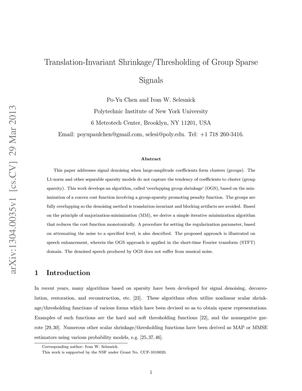 This paper addresses signal denoising when large-amplitude coefficients form clusters (groups). The L1-norm and other separable sparsity models do not capture the tendency of coefficients to cluster (group sparsity). This work develops an algorithm, called óverlapping group shrinkage' (OGS), based on the minimization of a convex cost function involving a group-sparsity promoting penalty function. The groups are fully overlapping so the denoising method is translation-invariant and blocking artifacts are avoided. Based on the principle of majorization-minimization (MM), we derive a simple iterative minimization algorithm that reduces the cost function monotonically. A procedure for setting the regularization parameter, based on attenuating the noise to a specified level, is also described. The proposed approach is illustrated on speech enhancement, wherein the OGS approach is applied in the short-time Fourier transform (STFT) domain. The denoised speech produced by OGS does not suffer from musical noise.