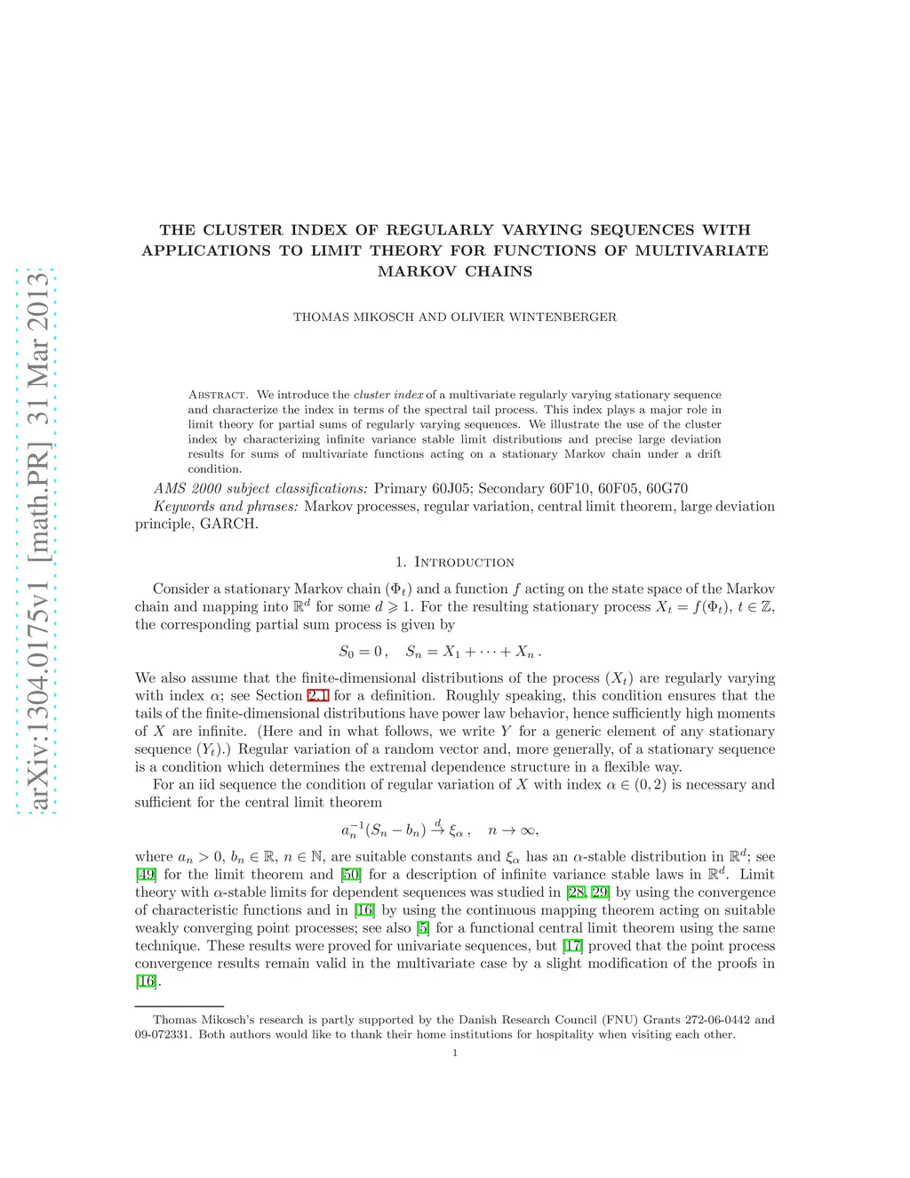 We introduce the cluster index of a multivariate regularly varying stationary sequence and characterize the index in terms of the spectral tail process. This index plays a major role in limit theory for partial sums of regularly varying sequences. We illustrate the use of the cluster index by characterizing infinite variance stable limit distributions and precise large deviation results for sums of multivariate functions acting on a stationary Markov chain under a drift condition.