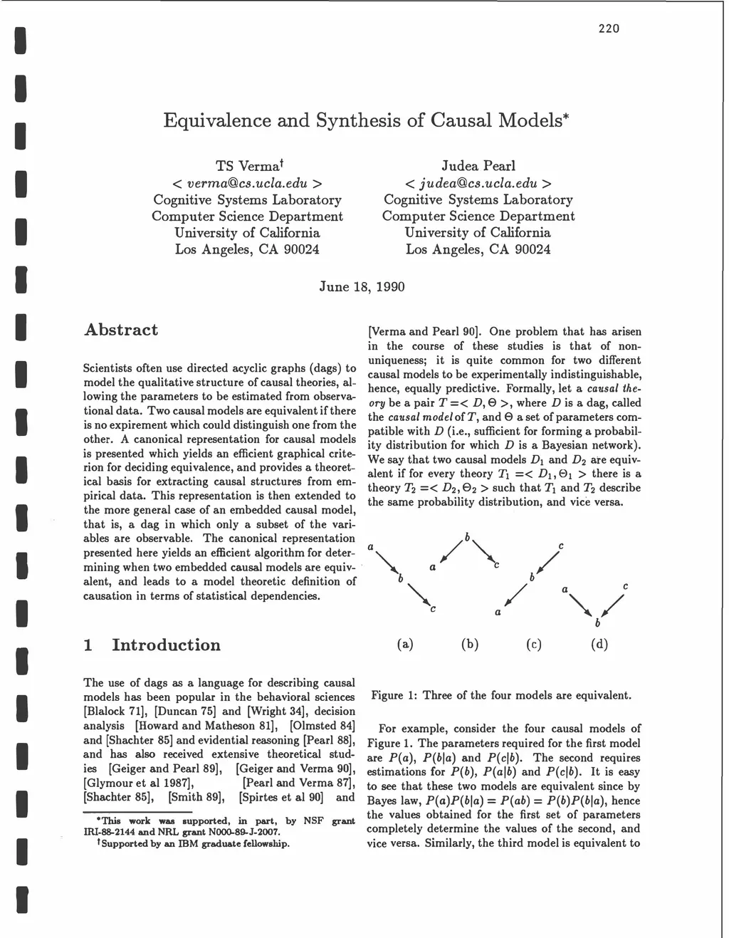 Scientists often use directed acyclic graphs (days) to model the qualitative structure of causal theories, allowing the parameters to be estimated from observational data. Two causal models are equivalent if there is no experiment which could distinguish one from the other. A canonical representation for causal models is presented which yields an efficient graphical criterion for deciding equivalence, and provides a theoretical basis for extracting causal structures from empirical data. This representation is then extended to the more general case of an embedded causal model, that is, a dag in which only a subset of the variables are observable. The canonical representation presented here yields an efficient algorithm for determining when two embedded causal models reflect the same dependency information. This algorithm leads to a model theoretic definition of causation in terms of statistical dependencies.