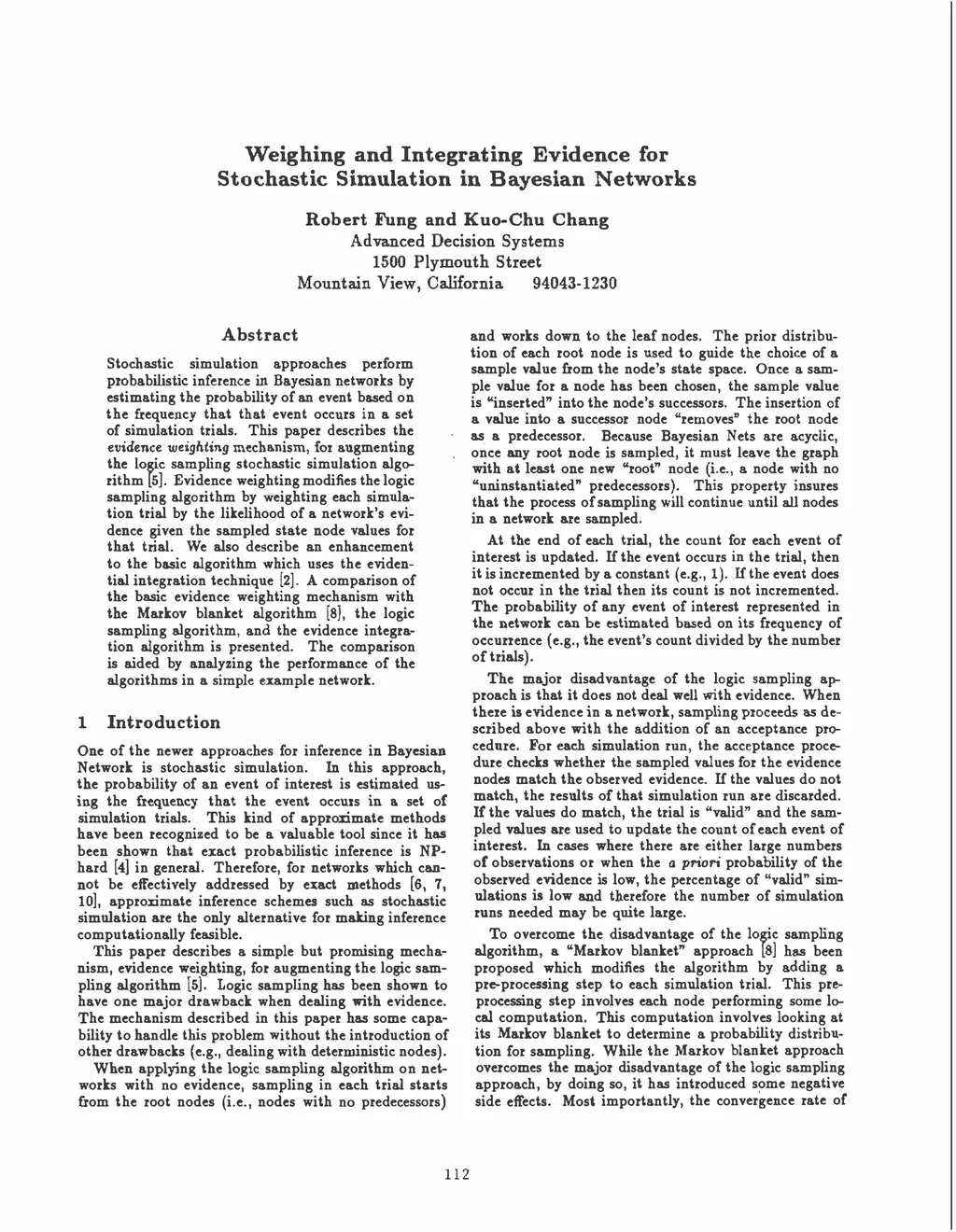 Stochastic simulation approaches perform probabilistic inference in Bayesian networks by estimating the probability of an event based on the frequency that the event occurs in a set of simulation trials. This paper describes the evidence weighting mechanism, for augmenting the logic sampling stochastic simulation algorithm [Henrion, 1986]. Evidence weighting modifies the logic sampling algorithm by weighting each simulation trial by the likelihood of a network's evidence given the sampled state node values for that trial. We also describe an enhancement to the basic algorithm which uses the evidential integration technique [Chin and Cooper, 1987]. A comparison of the basic evidence weighting mechanism with the Markov blanket algorithm [Pearl, 1987], the logic sampling algorithm, and the evidence integration algorithm is presented. The comparison is aided by analyzing the performance of the algorithms in a simple example network.