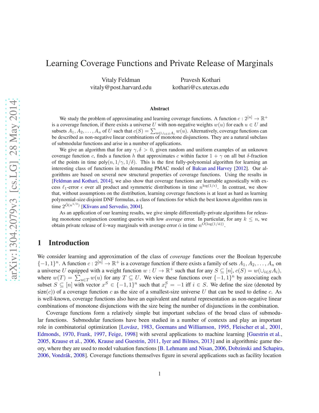 Learning Coverage Functions and Private Release of Marginals
